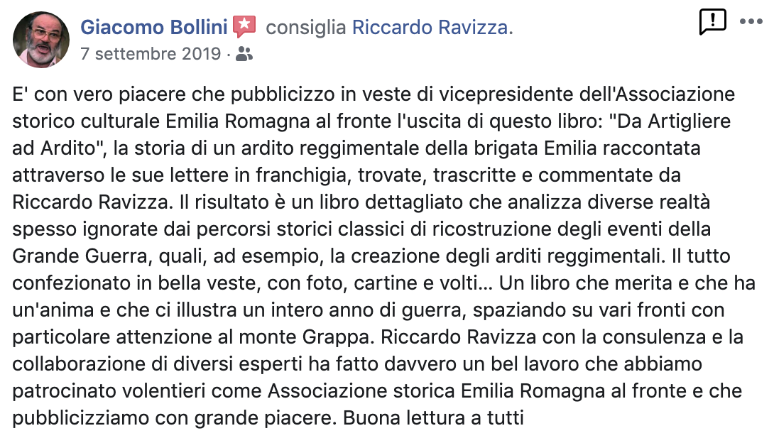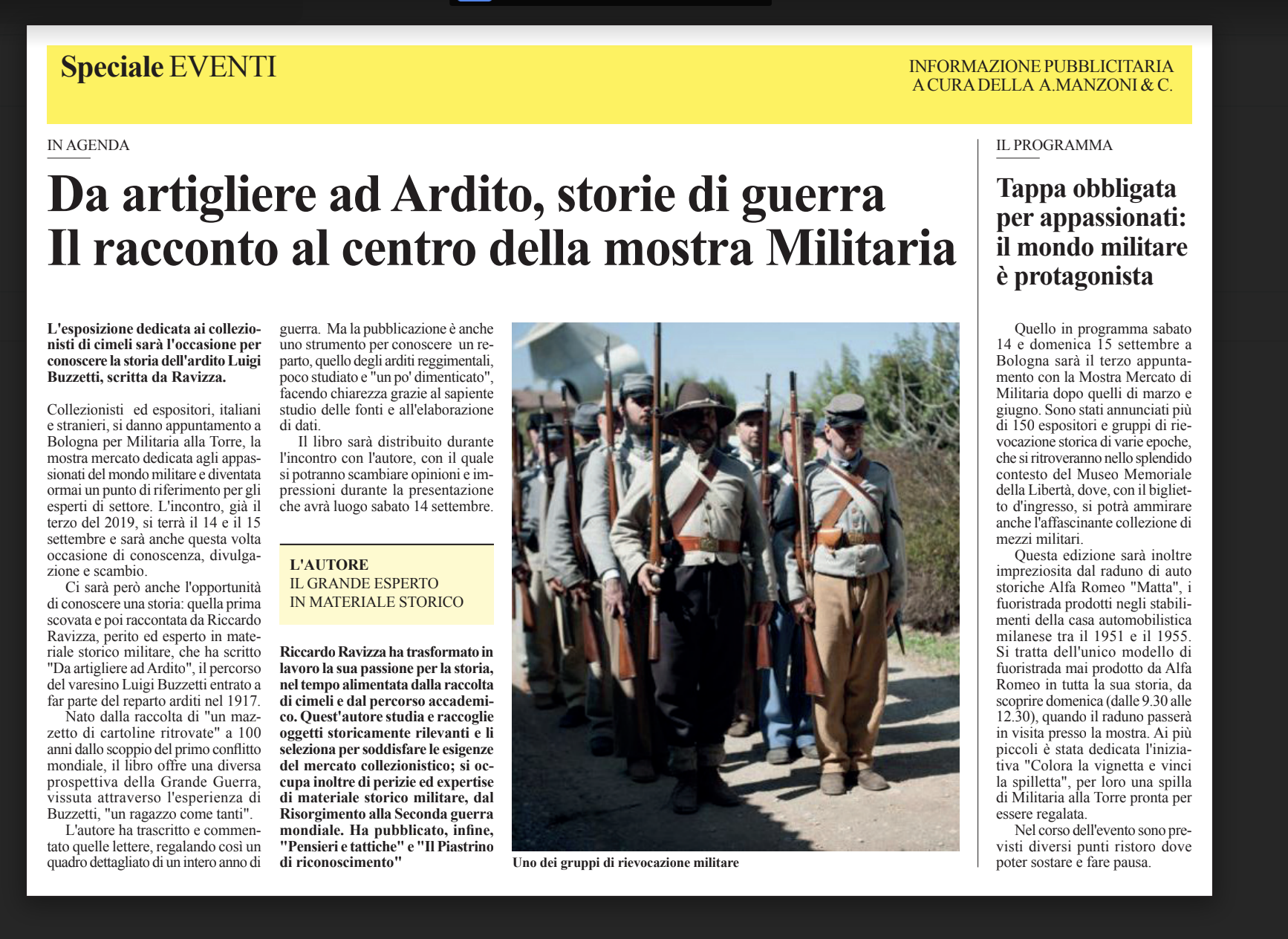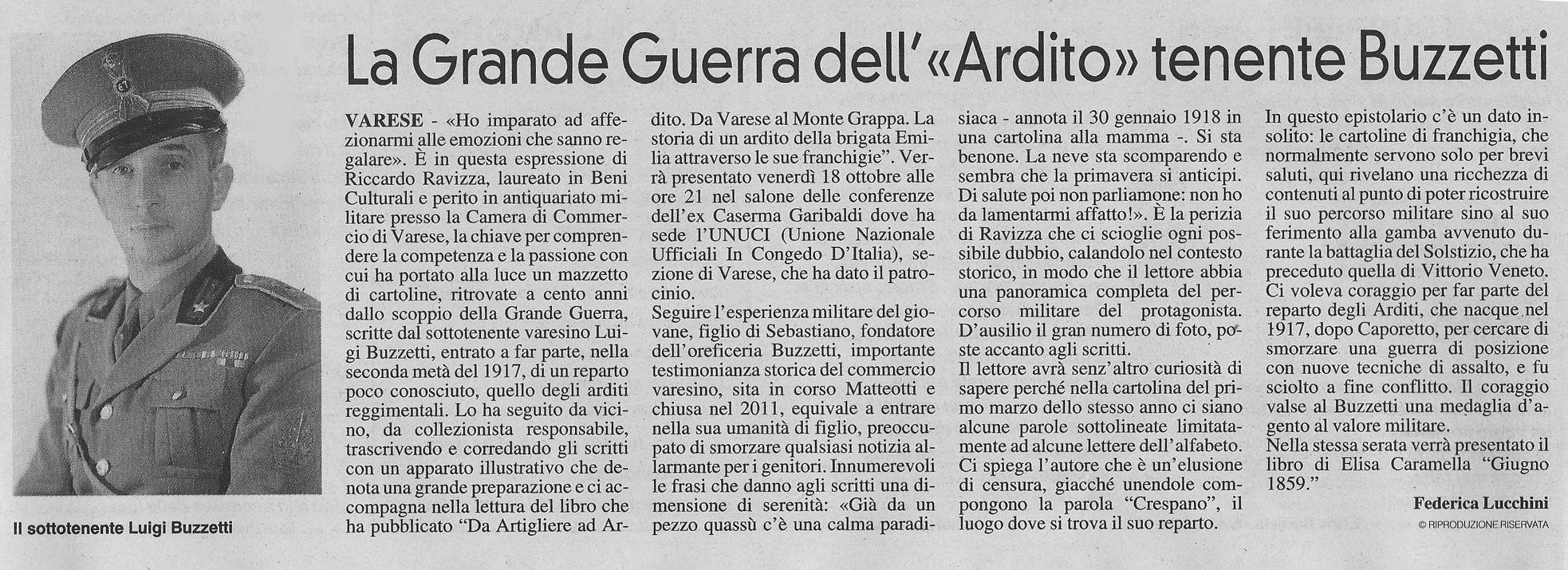 Da artigliere ad ardito nasce da un mazzetto di cartoline ritrovate a 100 anni dallo scoppio dalla Grande Guerra per riportare alla memoria la storia di un ragazzo che, come tanti altri, è stato protagonista in questo memorabile conflitto. Il varesino Luigi Buzzetti entra a far parte, nella seconda metà del 1917, di un reparto davvero poco studiato: quello degli arditi reggimentali. La pubblicazione mira a render omaggio a questi reparti un po’ dimenticati ed a fare chiarezza, fonti alla mano, sulla storia degli arditi reggimentali. Diversi sono i luoghi percorsi e le tematiche affrontate. Da Torino a Gorizia, dalla tranquilla accademia militare all’insidiosa trincea, dall’artiglieria ai reparti d’assalto. Combattendo dalla disfatta di Caporetto alla battaglia del Solstizio.