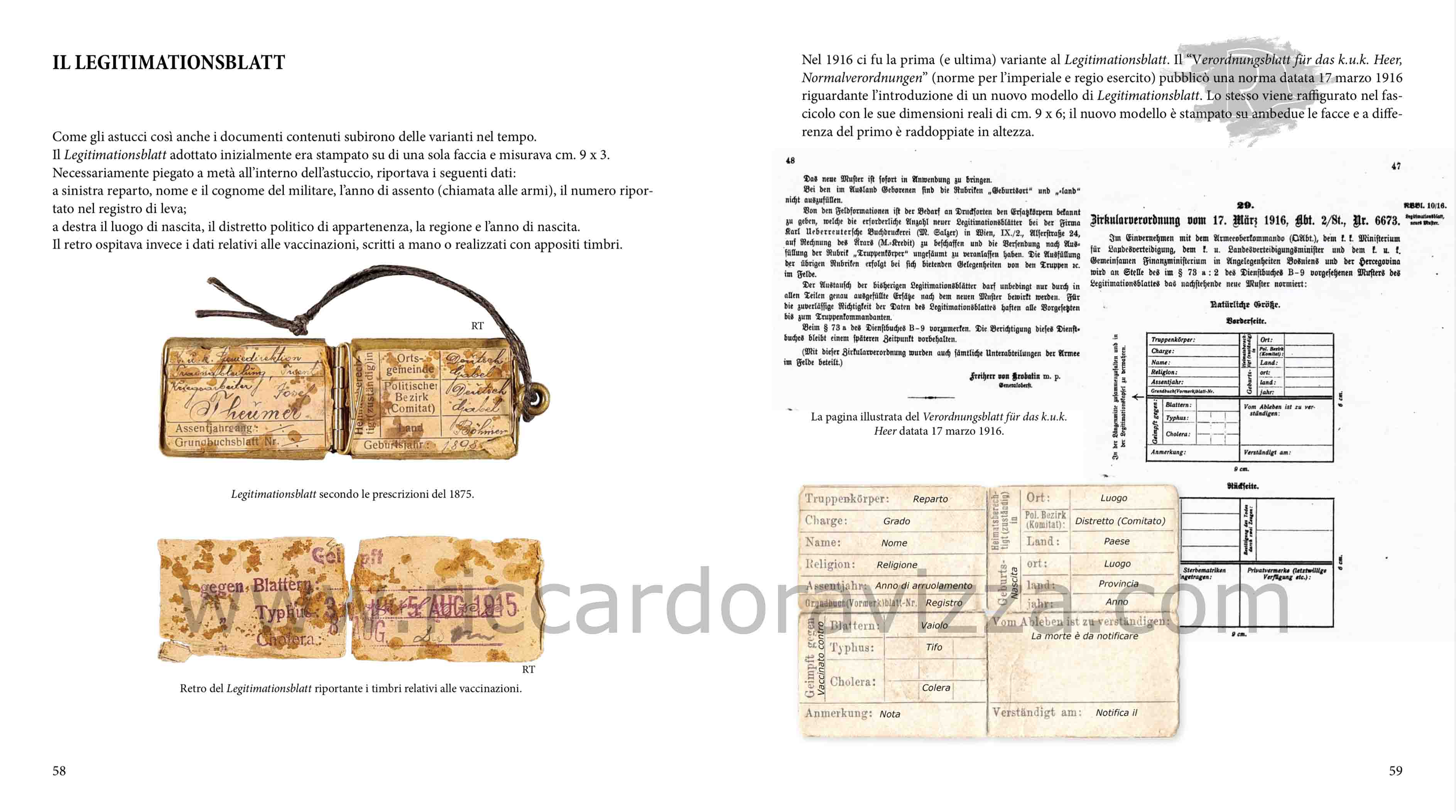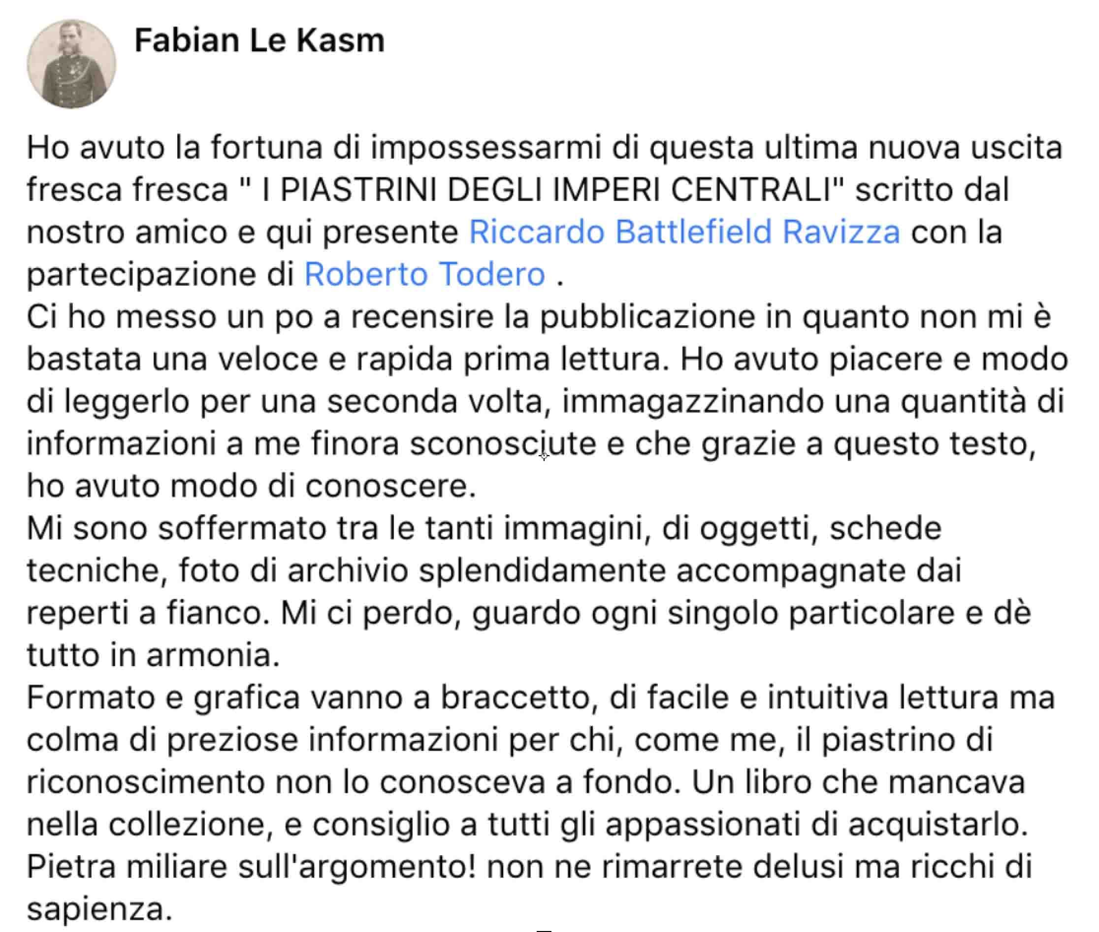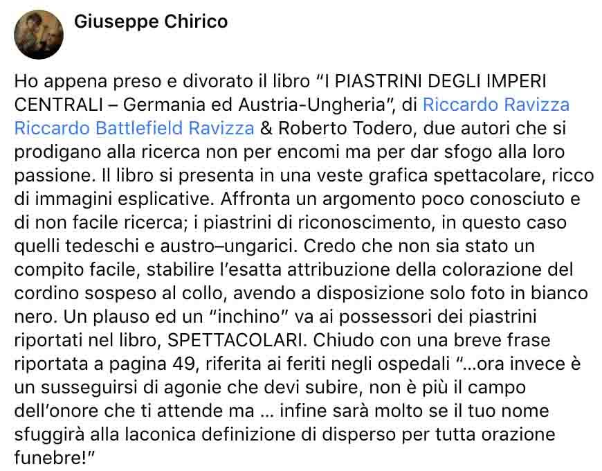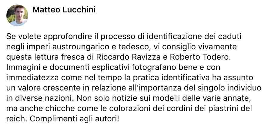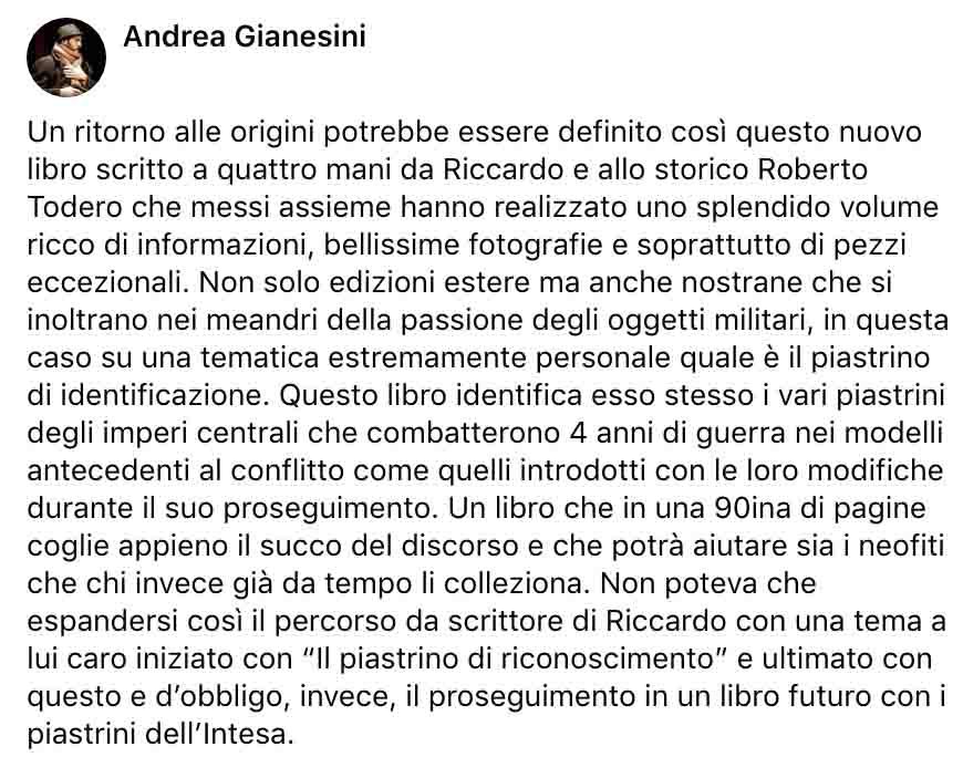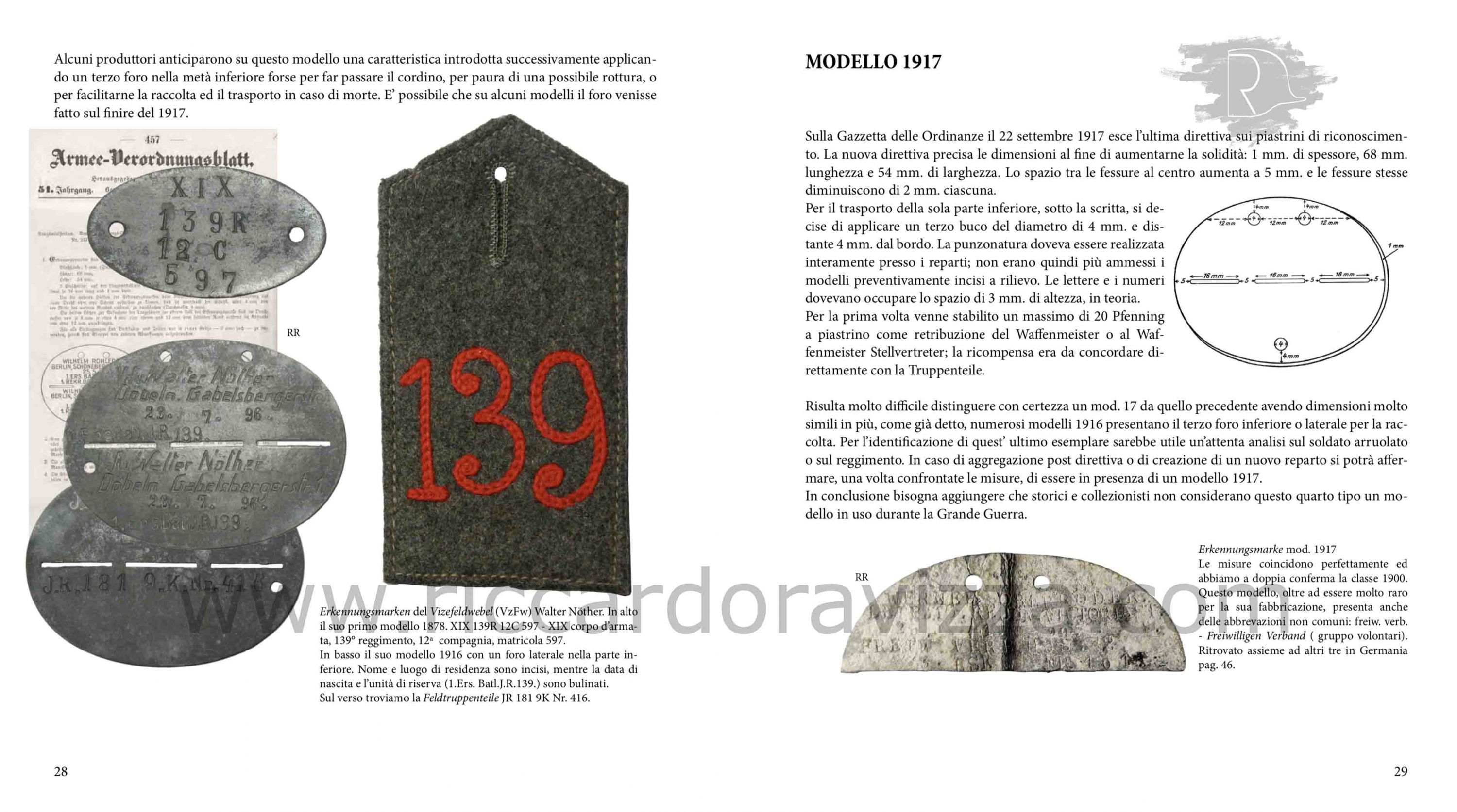 Dopo il primo saggio «Il Piastrino di Riconoscimento» (nel quale ho tracciato l’evoluzione e la nascita dei primi metodi di riconoscimento) propongo, a distanza di un paio d’anni, questa nuova pubblicazione fatta con il valido contributo di Roberto Todero. Assieme abbiamo analizzato e studiato nel dettaglio ogni modello presente nel corso della Grande Guerra nell’esercito imperiale tedesco ed in quello austroungarico. Grazie ad alcune fonti documentaristiche ed iconografiche dell’epoca è stato quindi possibile riconoscere e decifrare i modelli adottati nei due eserciti.
