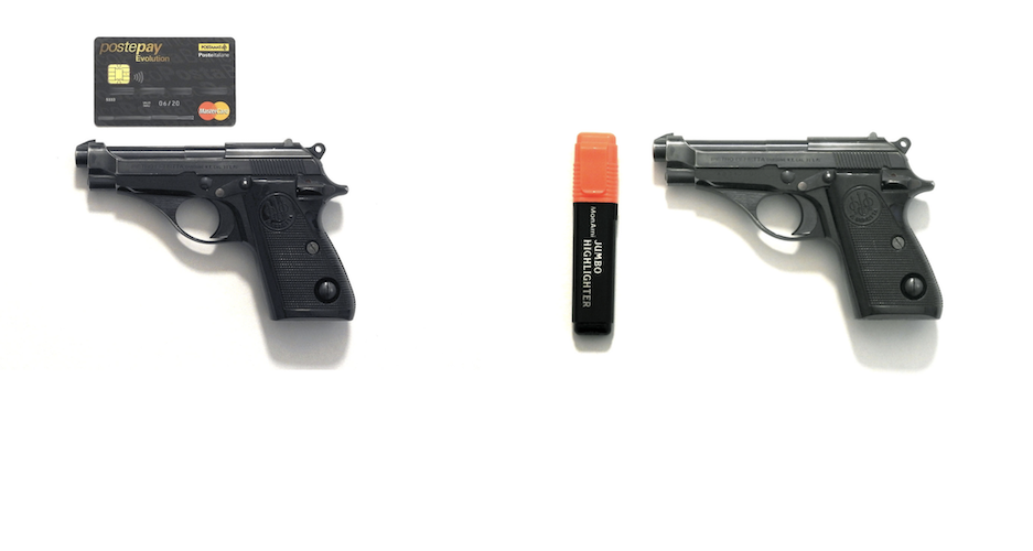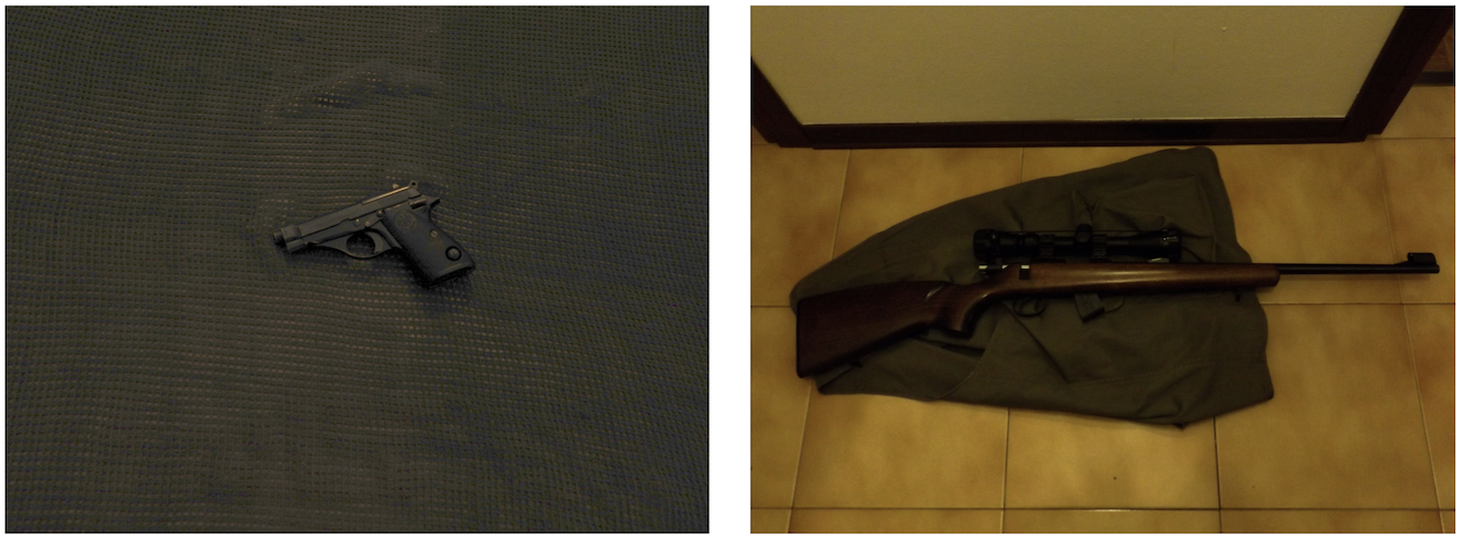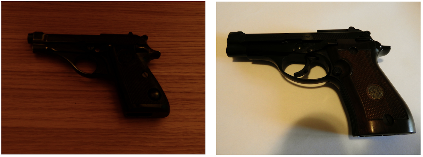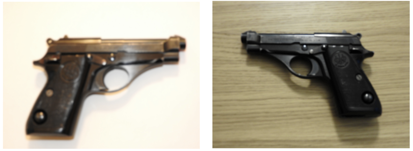 Nella prima foto partendo da sinistra si distingue la sagoma di una Beretta serie 70, ma non è possibile identificare né il calibro, né di conseguenza, il modello specifico. Nell'altra foto nonostante la foto risulti meno mossa della precedente consentendoci di identificare facilmente la sagoma della Beretta 70, non si riesce a distinguere nessun altro particolare utile (n. di matricola, marchi, dettagli, etc.)
