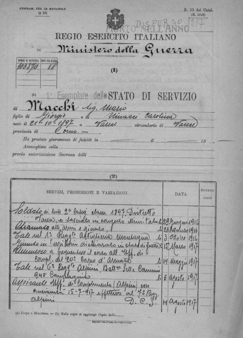 [N.B. Vi è una distinzione fra “foglio matricolare e ruolo matricolare”: il foglio matricolare è un documento legato al singolo militare, mentre il ruolo è il registro comune in cui vengono inseriti gli indici di tutti i fogli matricolari singolarmente compilati e conservati - dal “ruolo” si parte per la ricerca del “foglio”, sebbene i dati contenuti siano in sintesi gli stessi].