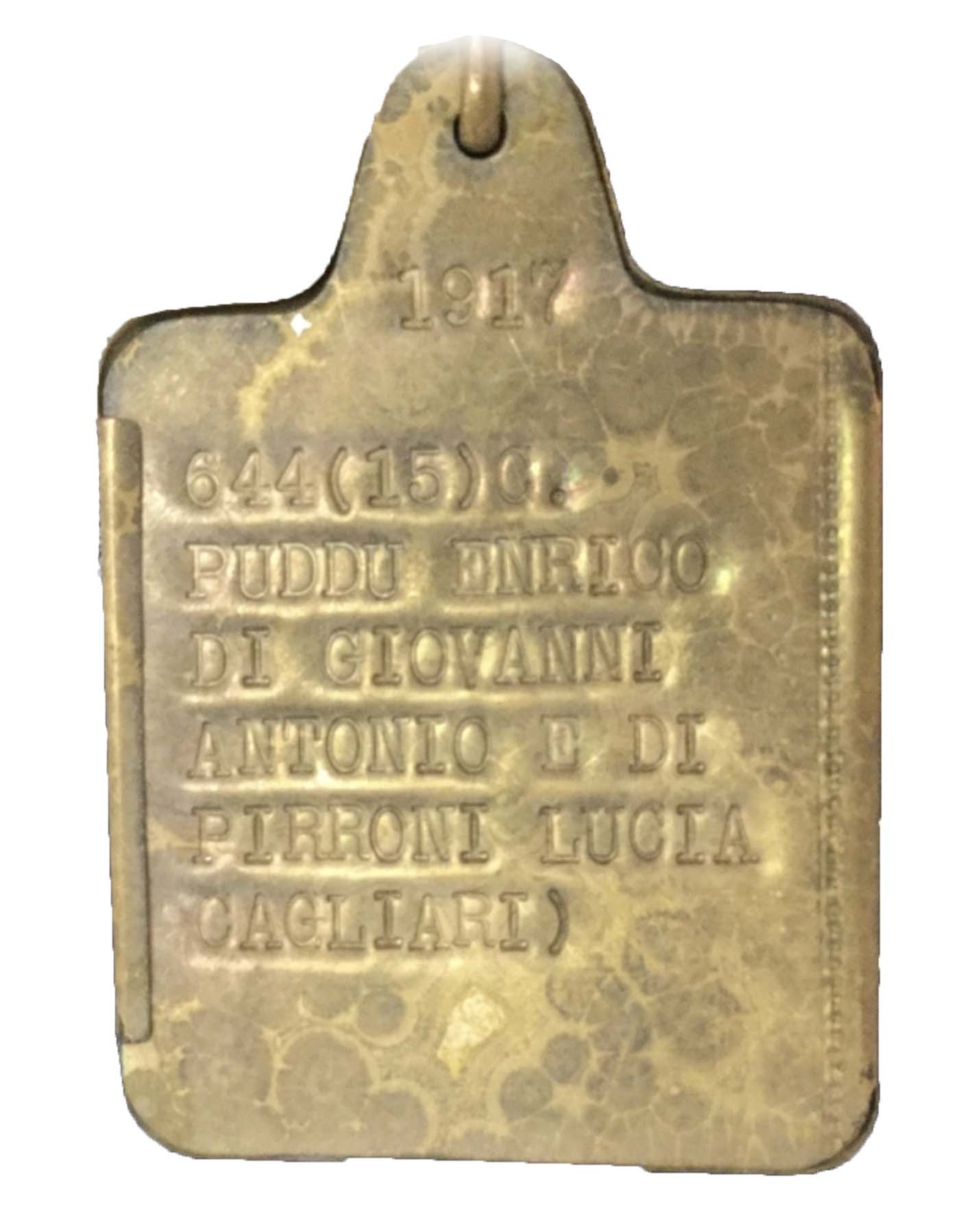 Piastrina trovata in una busta spillata al suo foglio matricolare. La targhetta è stata rimossa dalla cartella e riposta nella cassaforte dell’Archivio di Cagliari perché considerata cimelio di guerra, il 27 maggio 2020.