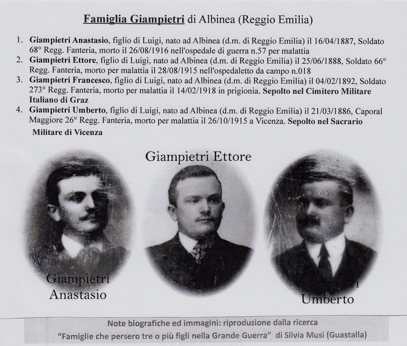A ricomporre tutti i tasselli della ricerca, dando un luogo di sepoltura a ben 4 fratelli deceduti durante la Grande Guerra, è Ettore Giampietri. Una piccola grande impresa, da attribuire alla sete di verità e all'interesse da parte del nipote di uno dei quattro (di cui porta anche il nome).