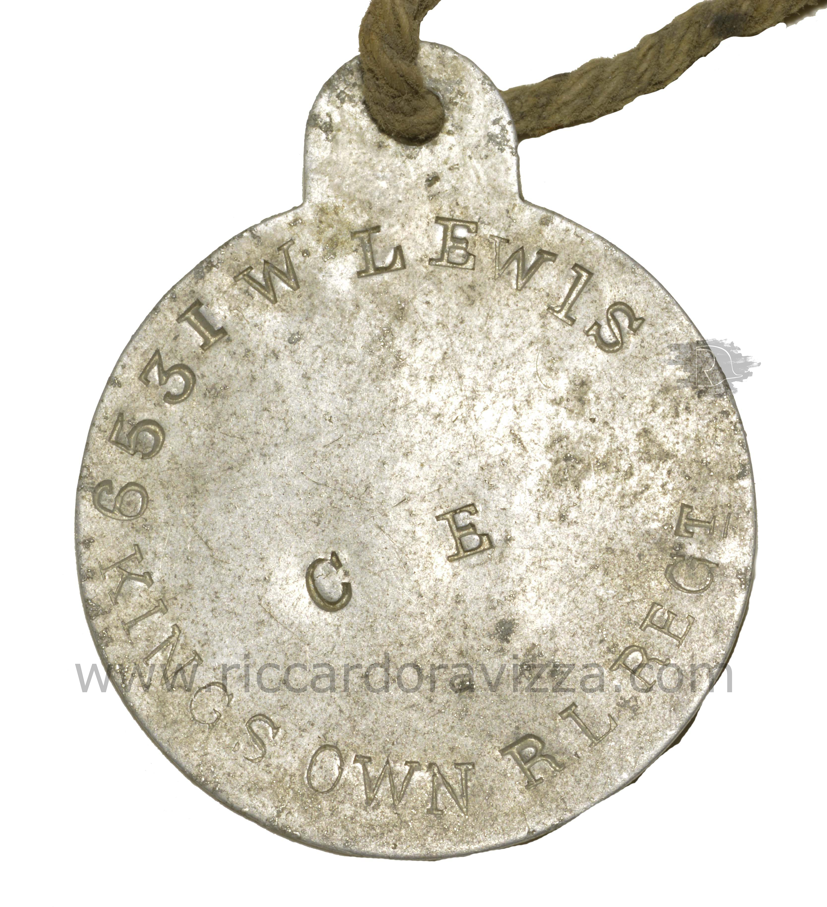 Il primo modello britannico, che, come l’equivalente statunitense, prese il nome di identity disc, entrò in vigore nel gennaio 1907 con il nuovo articolo (Army order) n. 9 del Regolamento e Ordinamento Reale per l’esercito96. Si tratta di una sottile placchetta circolare di alluminio di 42 mm. di diametro recante: nome, cognome, grado, reggimento e confessione religiosa (quest’ultima informazione era ritenuta essenziale per la determinazione del modo di sepoltura). Una piccola espansione del margine, forata, consente il passaggio del cordino necessario per la sospensione al collo.