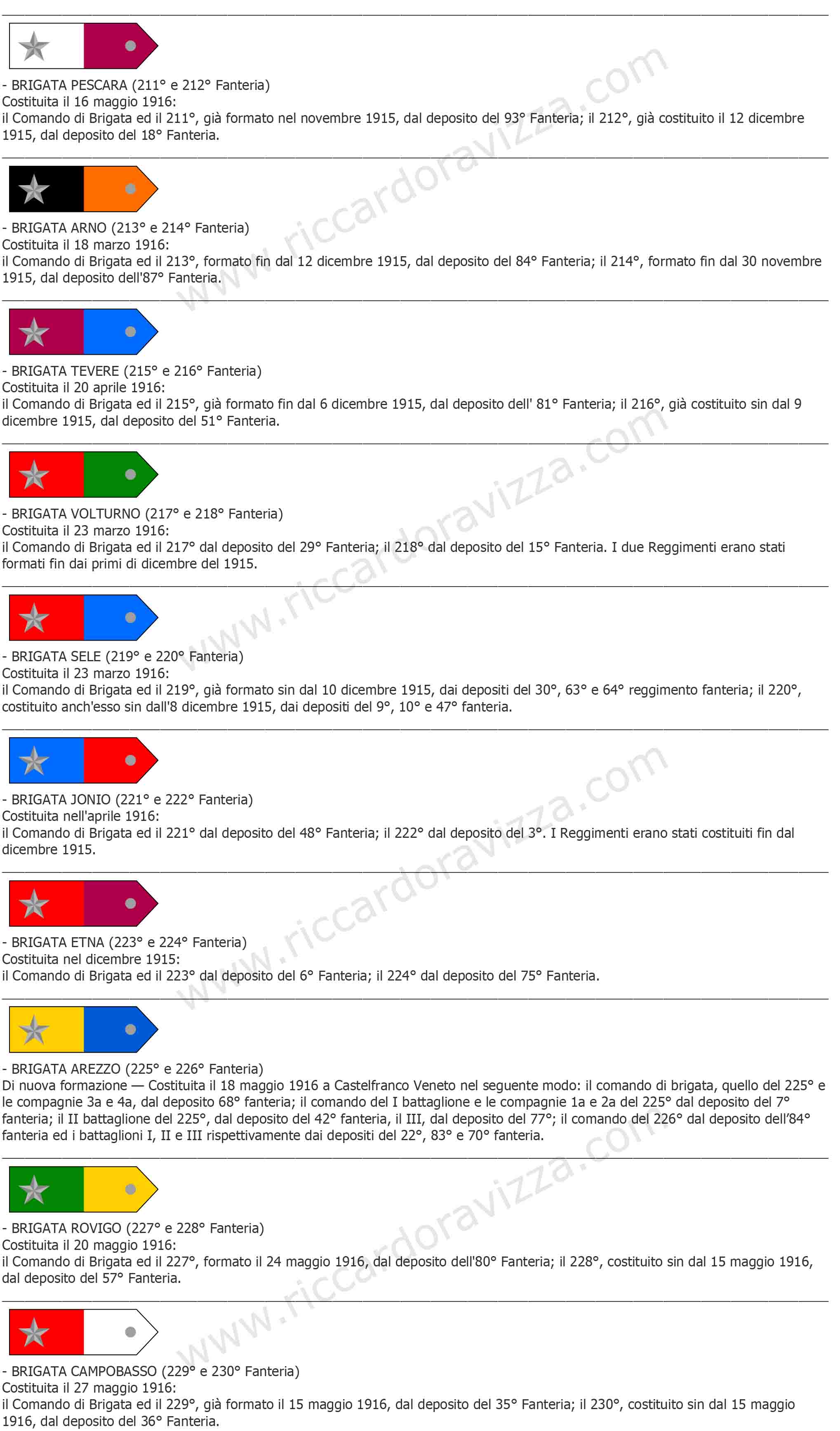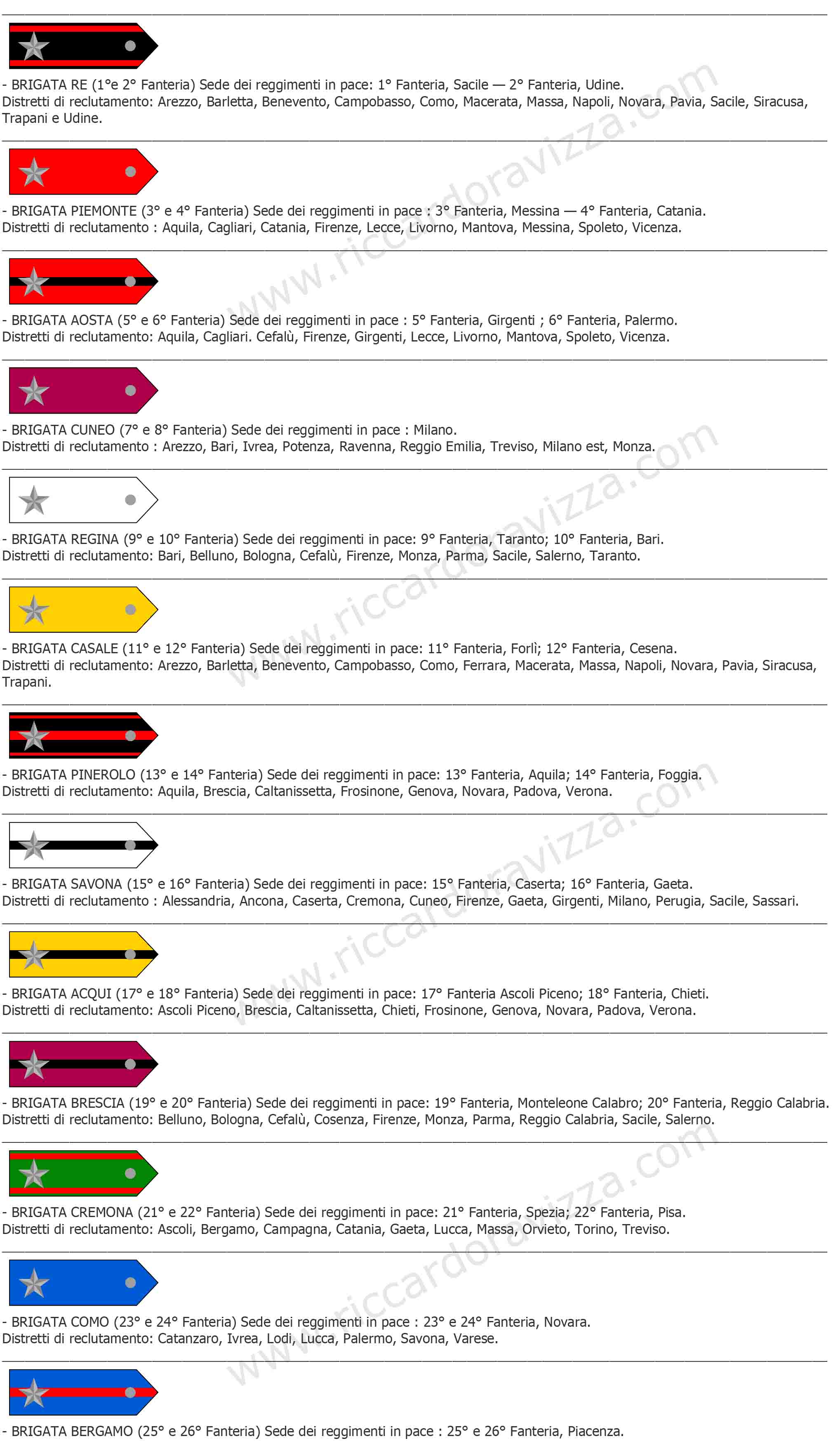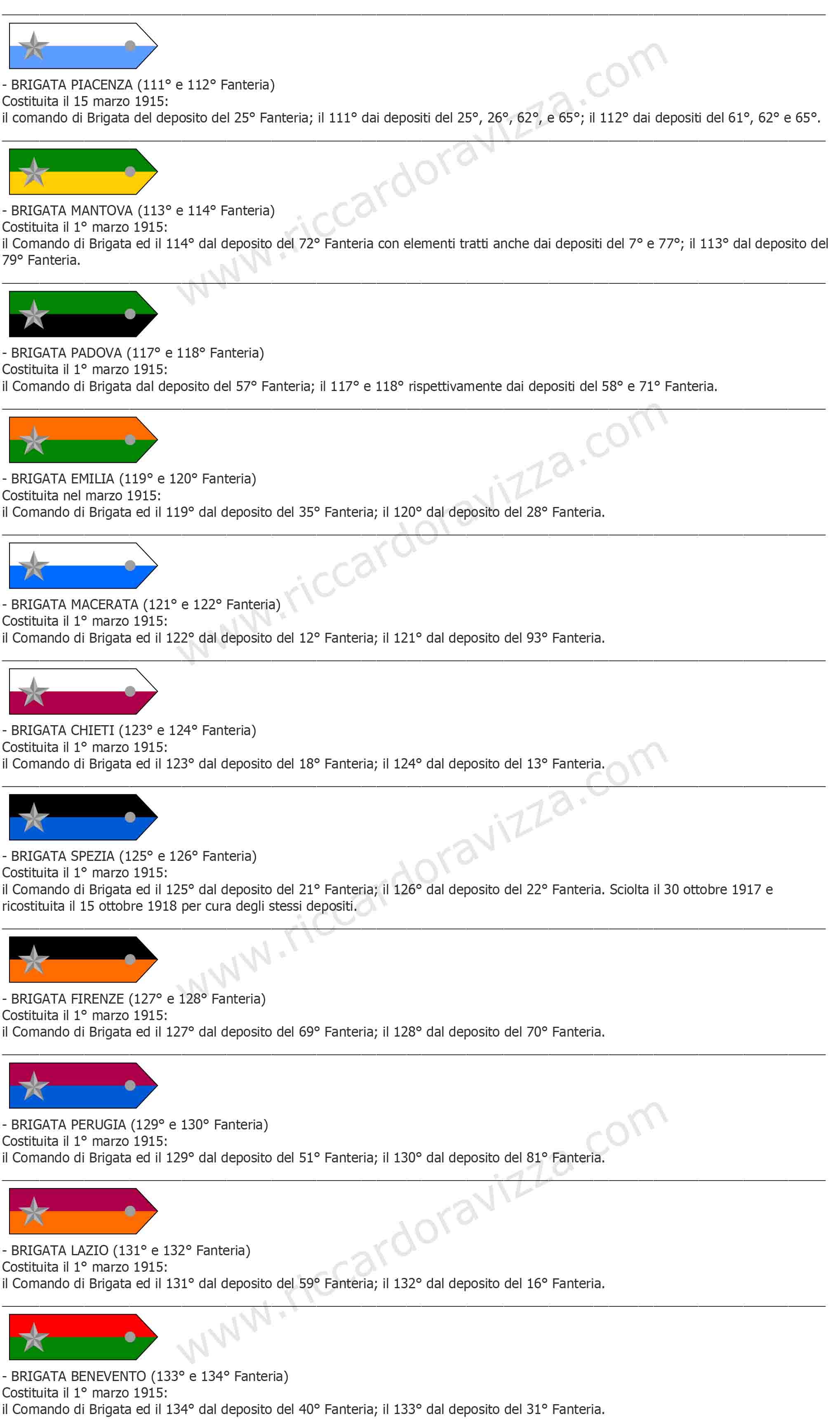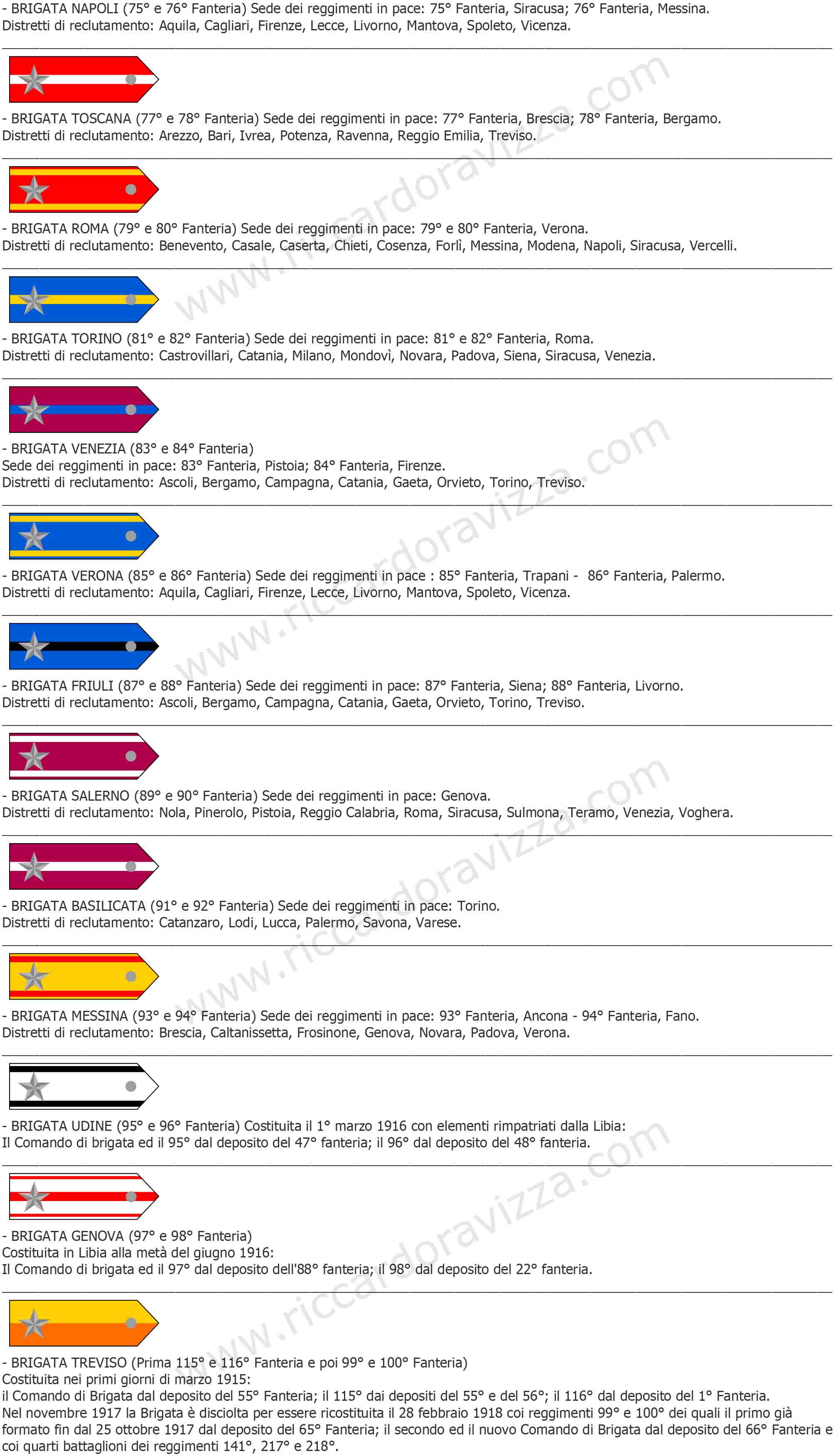 Le mostrine delle brigate di fanteria che si sono battute durante la Grande Guerra, con i corrispettivi distretti di reclutamento. Tutti le mostrine e i colori per poterle riconoscere.