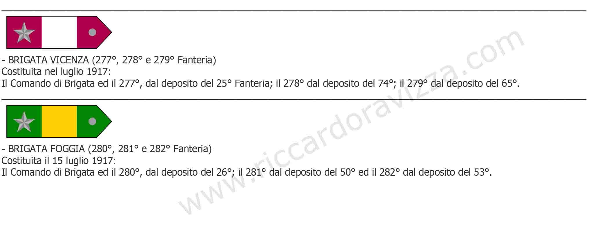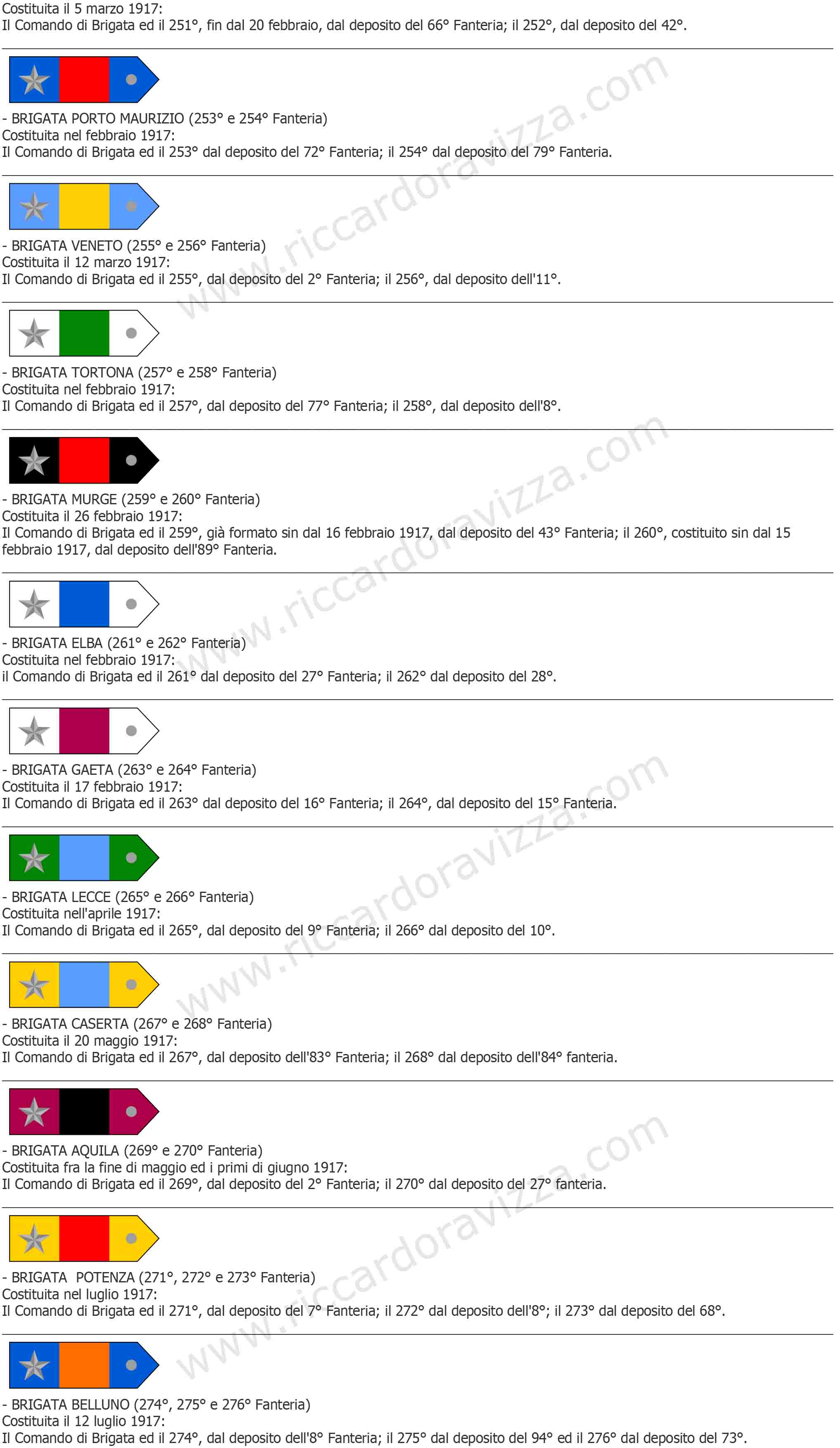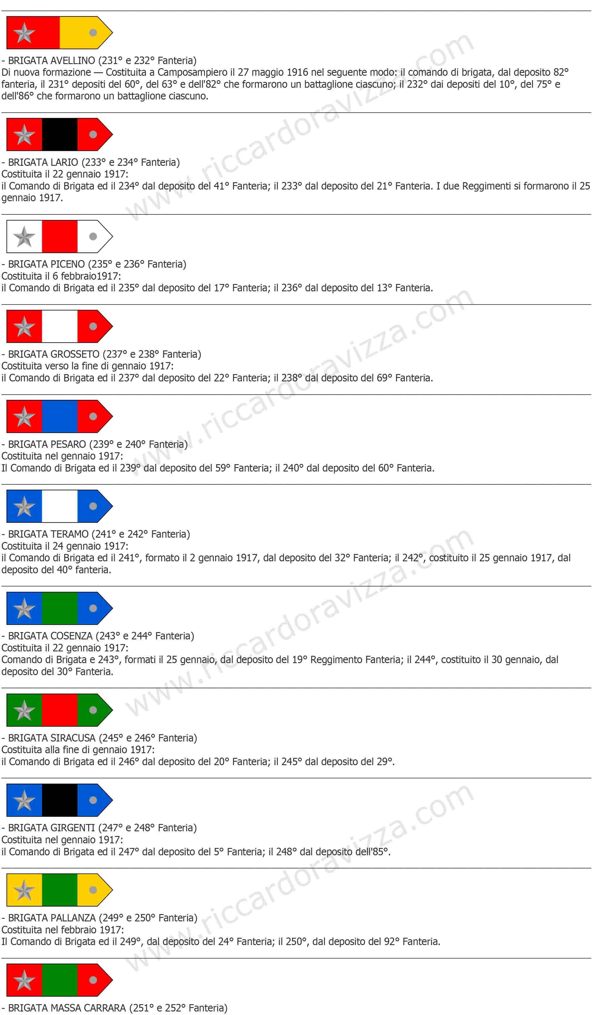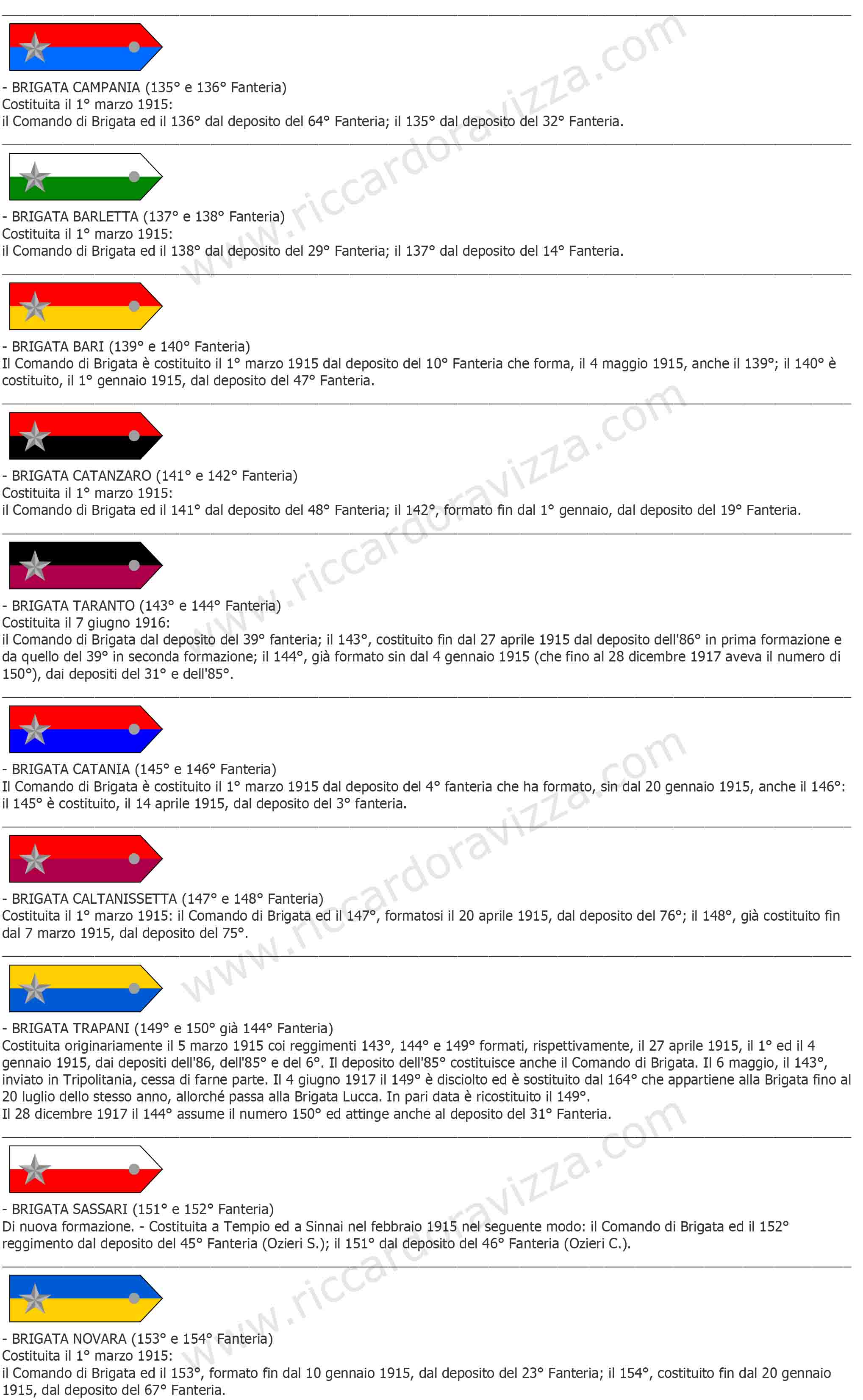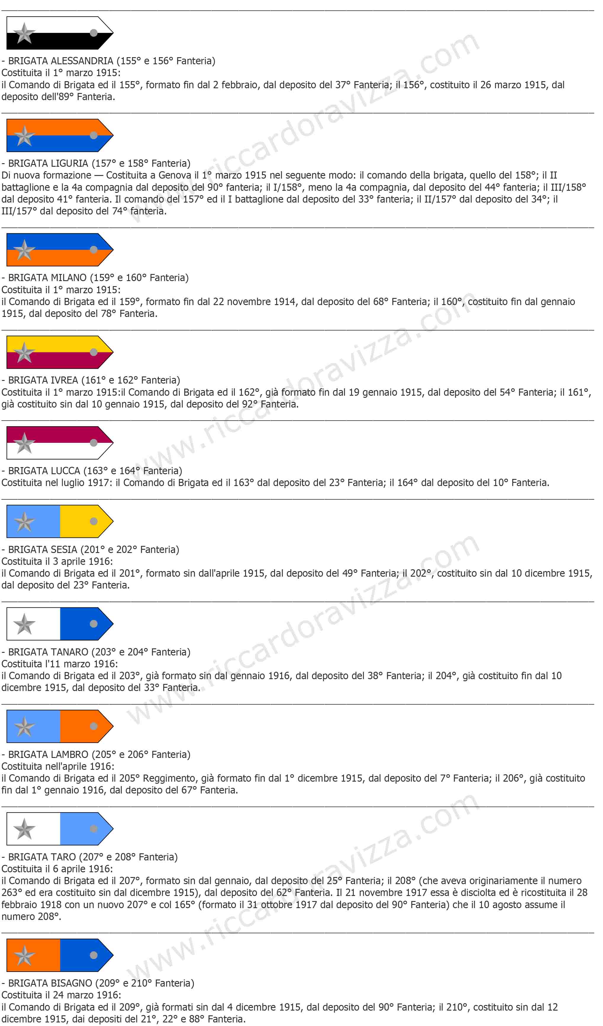 Le mostrine delle brigate di fanteria che si sono battute durante la Grande Guerra, con i corrispettivi distretti di reclutamento. Tutti le mostrine e i colori per poterle riconoscere.