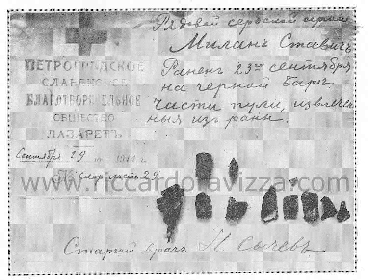 Nell'immagine possiamo vedere alcuni frammenti estratti presso l'ospedale russo di Valievo dalla ferita di un soldato serbo. In questo ospedale i medici hanno confermato il massiccio utilizzo da parte dell'esercito austroungarico delle pallottole esplosive. Oltre a questi proiettili gli austriaci usarono anche delle palle espansive o dilatabili denominate "Dum-Dum", tutt'altra cosa rispetto a queste qui trattate.