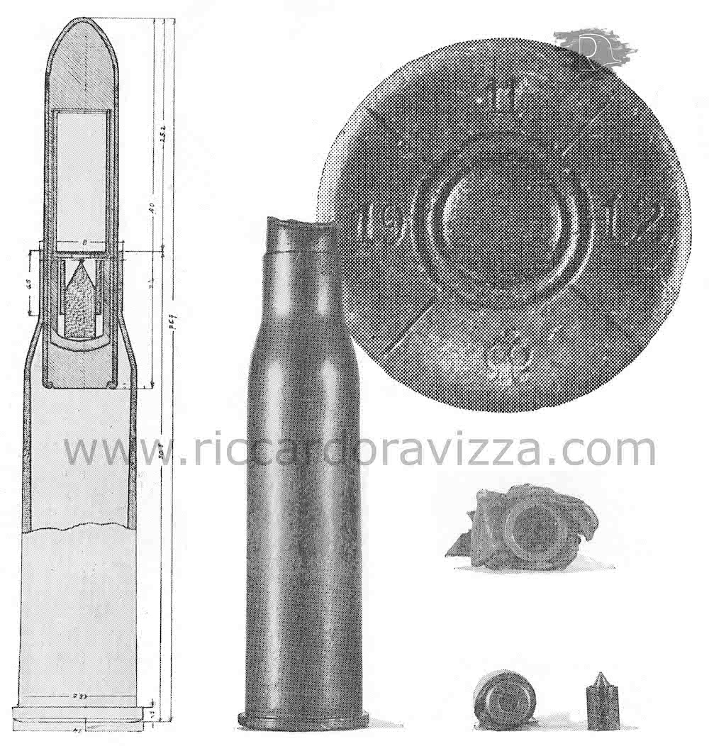 Come possiamo vedere nella figura in basso, impresse sul fondo troviamo la data 1912, l'aquila austriaca e il marchio di fabbrica (Fabbrica dello Stato di Wellersdorf vicino Vienna). Smontando il proiettile, all'epoca, hanno da subito constatato che all'interno del bossolo si trovava la normale polvere da sparo ma nell'ogiva si celava una sorpresa, riporto testuali parole tradotte dal francese:
