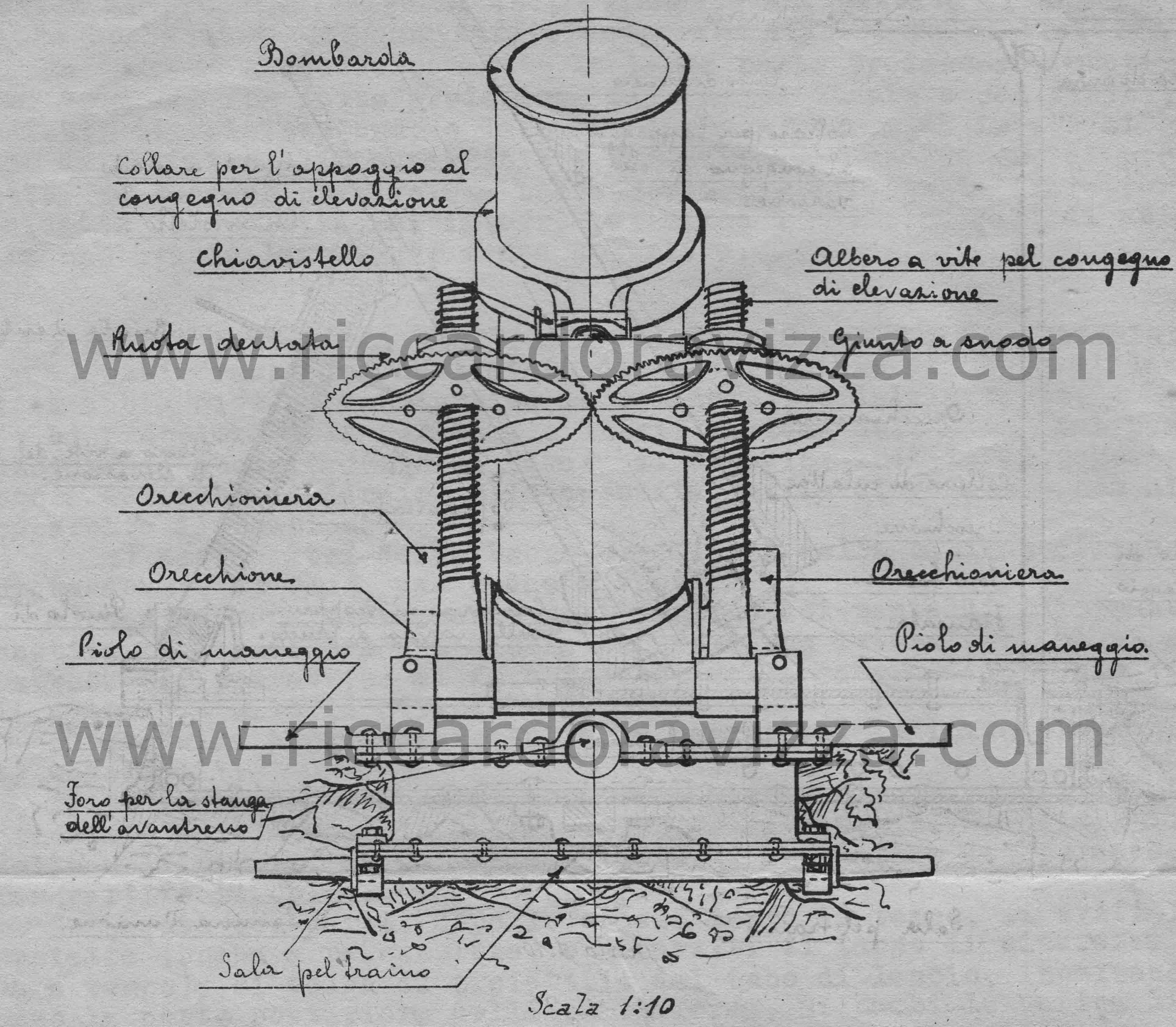 due appositi supporti fermati alla piattaforma; sui due alberi sono calettate due ruote di maneggio sui cui mozzi è montato un braccio con giunto a snodo per l'appoggio del collare anteriore del tubo di lancio; le due ruote sono dentate ed ingranano l'una coll'altra in modo che, facendone agire anche una sola due alberi a vite sollevando il braccio suddetto e conseguentemente variando l'inclinazione della bombarda.