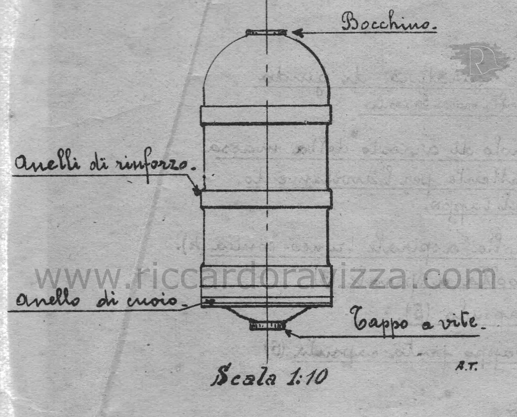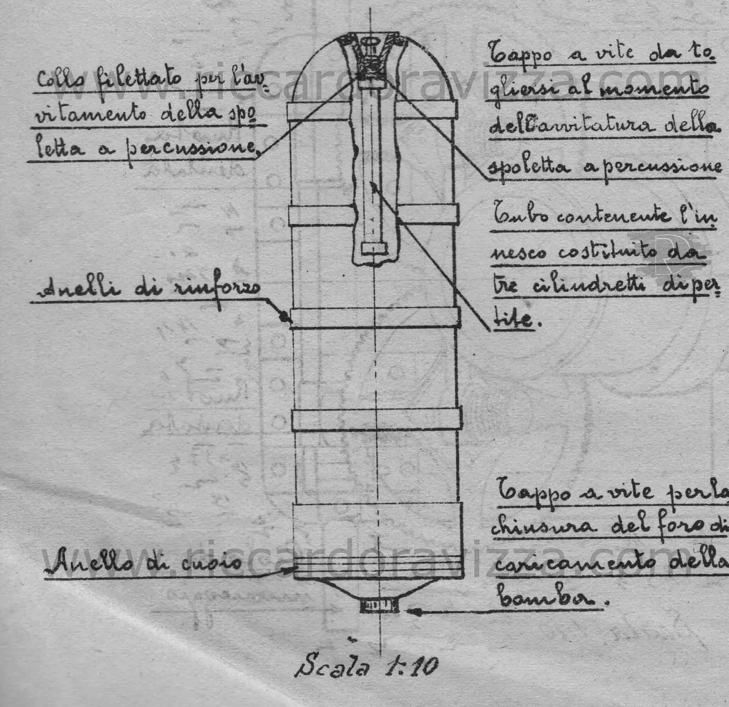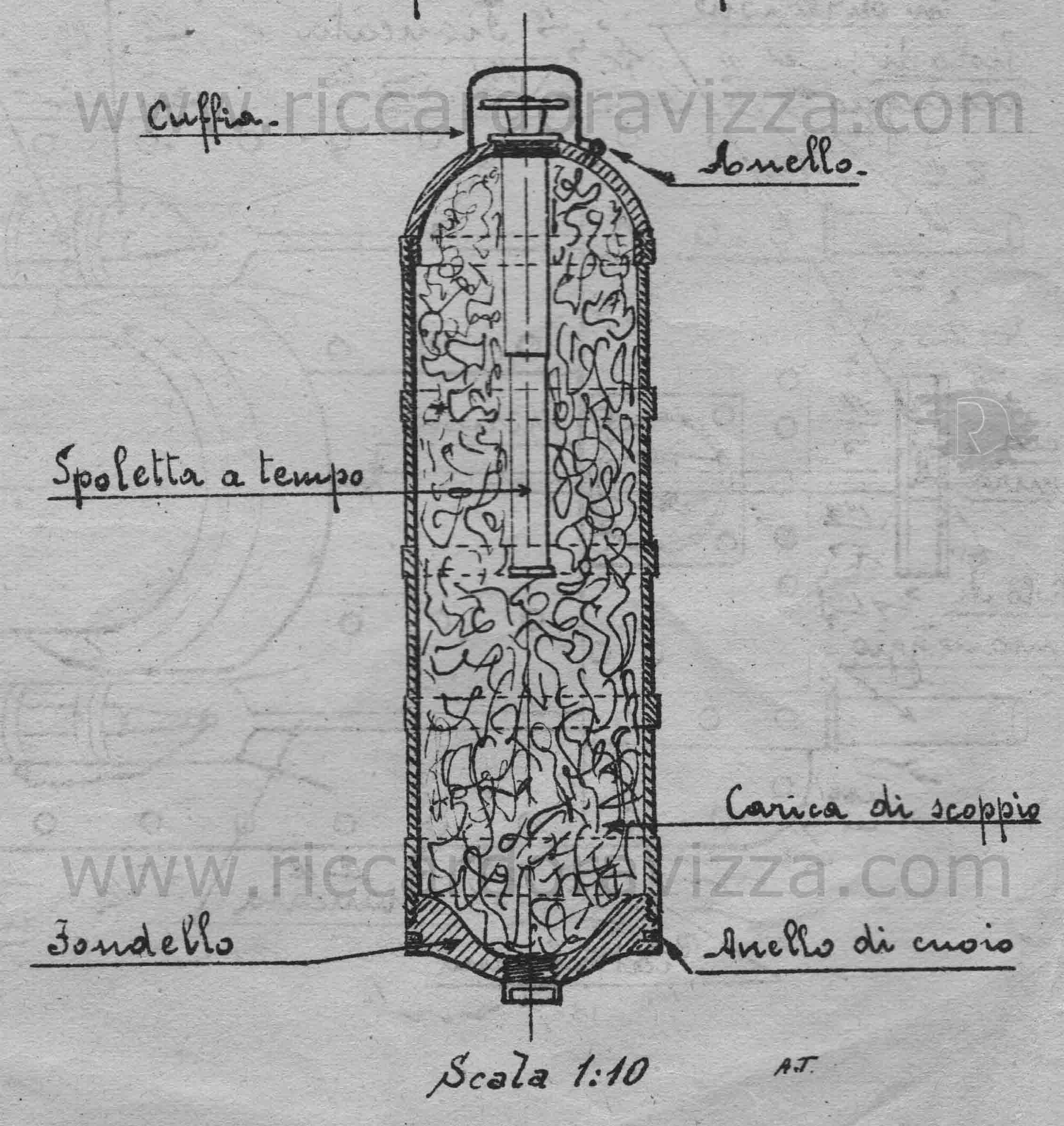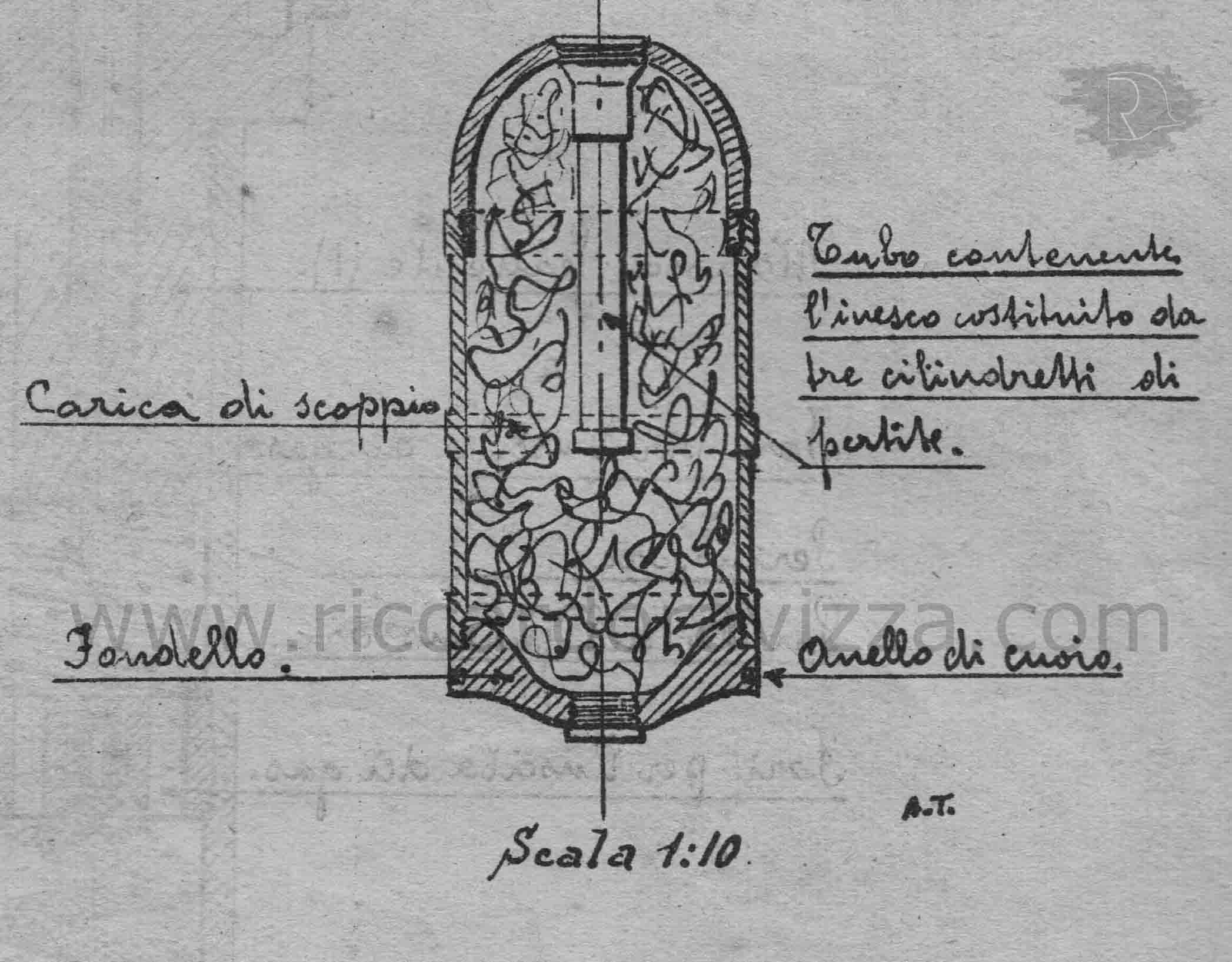 Bomba di cm. 78 di lunghezza, costituita da un turbo cilindrico di ferro dello spessore di cm. 1 rinforzato da due o cinque anelli, talvolta forzati talvolta ricavati al tornio; alla parte anteriore del cilindro è avvitata una calotta sferica alla quale viene fissato il congegno d'accensione; a quella posteriore è avvitato un fondello di cm. 2 di spessore con anello di cuoio o di altra materia analoga e con un foro, per il caricamento della bomba, chiuso da un tappo a vite; il proiettile pesa carico Kg. 76 e contiene circa Kg. 22 di alto esplosivo (tipo ammonal).