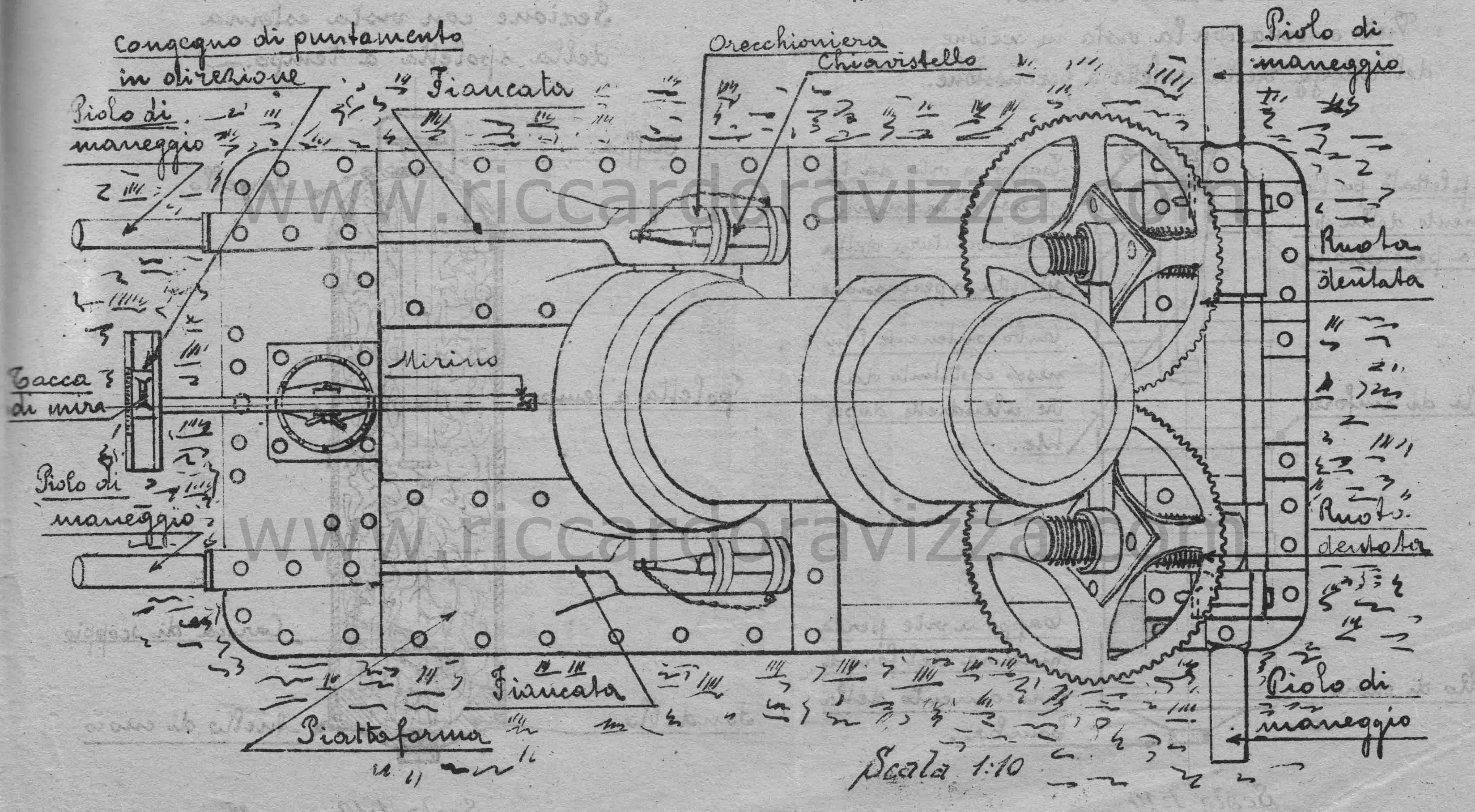 Il cọngegno di puntamento costituito da un tubo di ferro, girevole attorno al suo asse, alto circa m. 1, fissato verticalmente sulla parte posteriore della piattaforma; questo tubo porta superiormente un braccio terminante da una parte con una tacca di mira scorrevole su di un regolo graduato e dall'altra con un mirino.