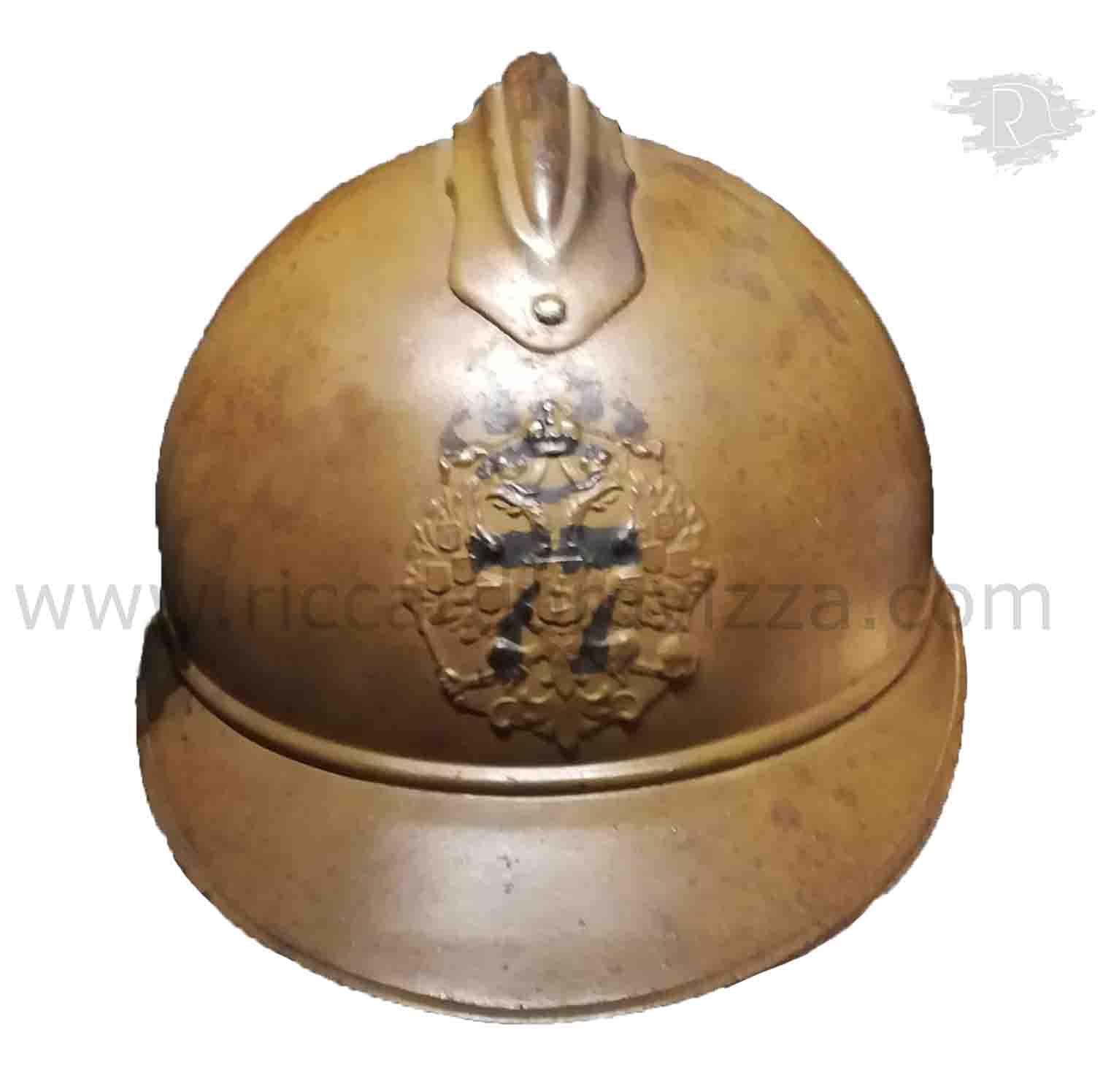 La situazione cambiò ancora nell’ultimo anno di guerra. Nel corso dell’autunno del 1917 infatti si susseguirono due fatti sconvolgenti nell’economia dello schieramento dell’Intesa: la progressiva defezione bellica della Russia e il pesante arretramento italiano, dovuto alla rotta di Caporetto. Proprio questi due avvenimenti comportarono un interessante retroscena per la storia degli elmetti nazionali. Negli ultimi mesi dell’anno la produzione francese si trovò di fronte al diniego bolscevico di ulteriori approvvigionamenti di Adrian, mentre l’Italia aveva assoluto bisogno di forniture aggiuntive, viste le perdite subite durante la ritirata dall’Isonzo verso il Piave. É così che non si trovò migliore soluzione che rifornire il Regio Esercito con una partita di elmetti francesi modello 1915 di colore marrone con le insegne zariste. Di questo utilizzo, fino ad ora, se ne avevano solo alcune vaghe citazioni*, non potendo contare su documentazione o materiale incontrovertibile. Tuttavia, proprio in occasione del centenario della Grande Guerra è stato esposto presso il Museo di storia militare di Vienna un raro elmetto russo, sopra il cui fregio metallico è presente a vernice nera l’insegna del 77° reggimento di fanteria, divisione Toscana. Ecco quindi la conferma che dopo il modello 1915, quello transizionale, che abbiamo chiamato 1915-16, e quello prodotto a partire dal 1916 dalle due ditte milanesi, le Forze armate nazionali utilizzarono una quarta versione del primordiale Adrian: quello russo italianizzato.