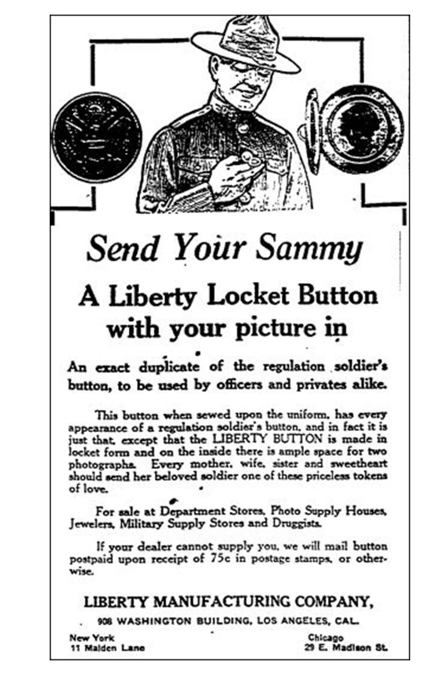 Nella foto in basso possiamo vedere una pubblicità del 16 maggio 1918 sul Los Angeles Times durante la prima guerra mondiale esorta ad inviare un bottone al proprio caro con una foto al suo interno.
