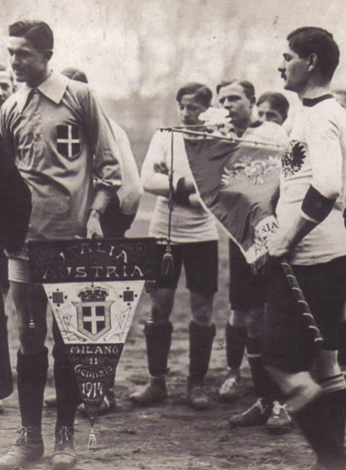 A qualche mese dallo scoppio della guerra una foto che ritrae i due capitani, Fossati e Mertz, durante uno scambio di gagliardetti. La partita come possiamo leggere su uno dei due gagliardetti si è giocata a Milano l'11 gennaio del 1914. il risultato, soddisfacente per un Italia che affrontava una squadra nettamente più forte, fu di 0-0.