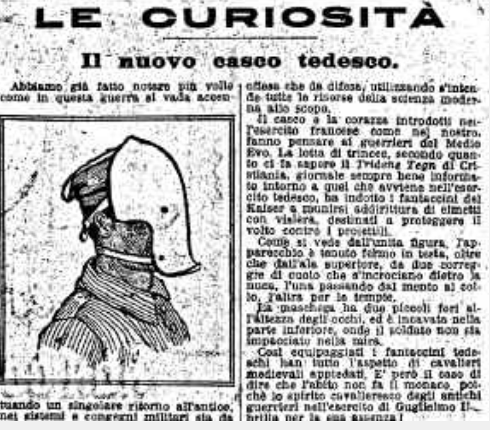 Abbiamo già fatto notare più volte come in questa guerra si vada accentuando un singolare ritorno dell'antico nei sistemi e nei congegni militari.....il casco e la corazza introdotti nell'esercito francese come nel nostro fanno pensare ai guerrieri del Medio Evo. La lotta di trincee, secondo quanto ci fà sapere il giornale ...... avviene nell'esercito tedesco, ha indotto i fantaccini del Kaiser a munirsi addirittura di elmetti con visiere, destinati a proteggere il volto contro i proiettili.