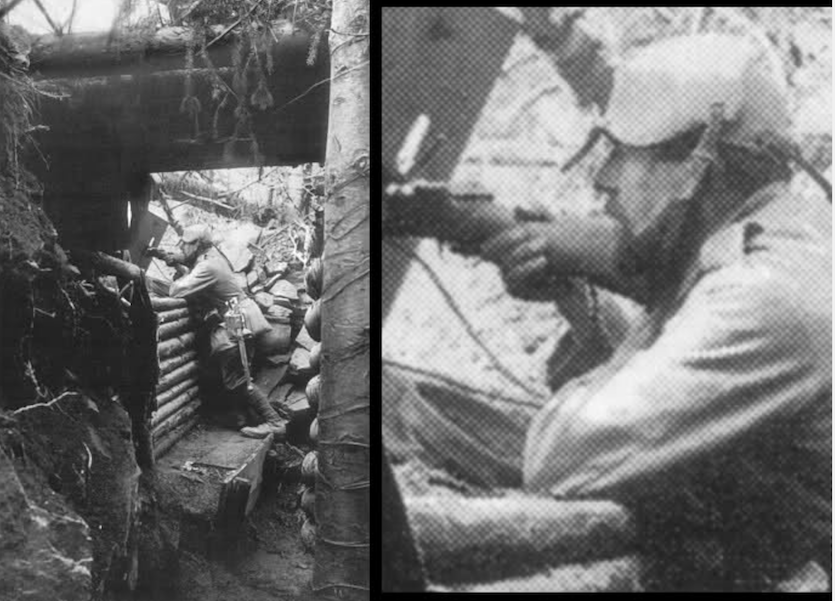 In questa foto del maggio 1915 si vede un tiratore, coperto da uno scudo da trincea con in testa la cervelliera Von Gaede. (Fonte: Eric Balmier & Daniel Roess’ ”Scènes des tranchées des Vosges”)