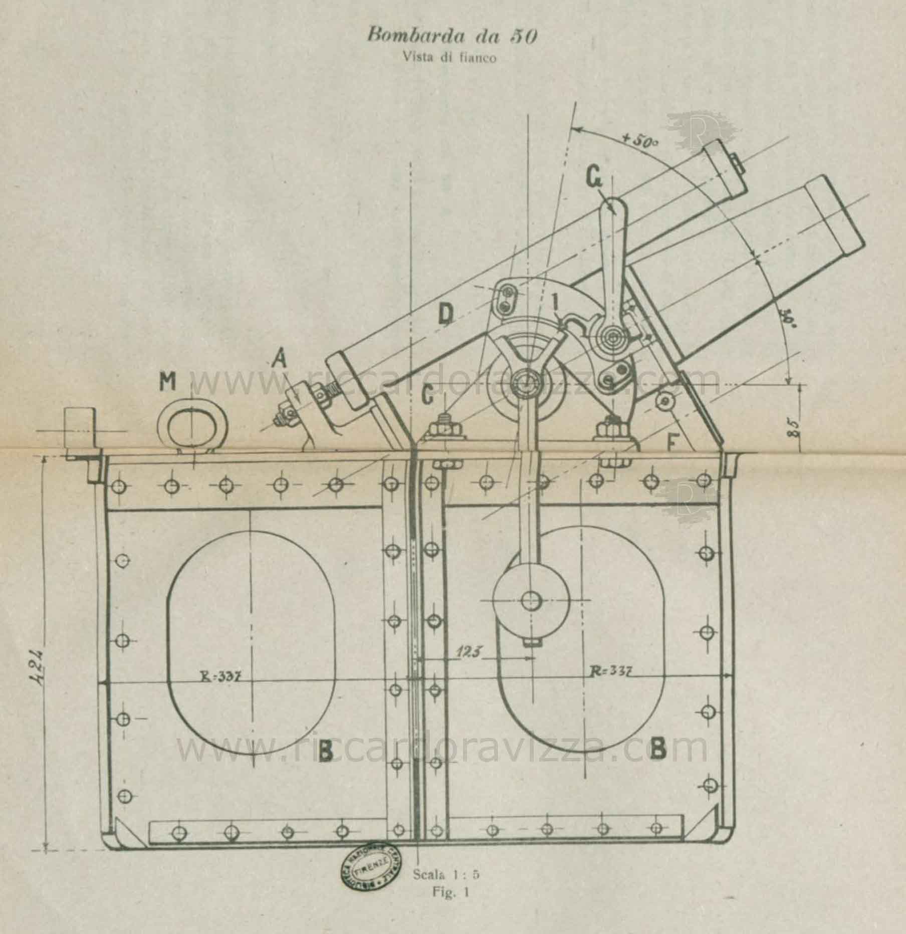 La bombarda da 50 (tipo Ansaldo), consta essenzialmente delle seguenti parti: Bombarda, Culla, Affusto.