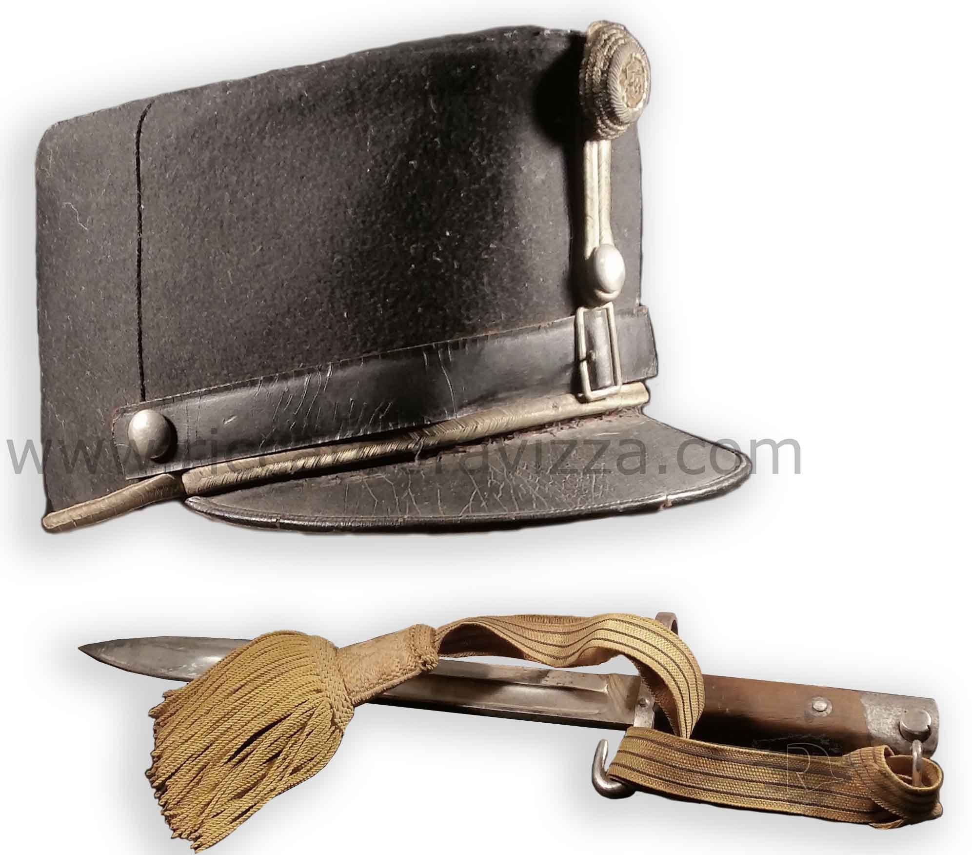 Die schwarze Offizierskappe, il berretto rigido nero per gli ufficiali. Un oggetto oggi comune nelle collezioni ma che è stato uno dei simboli più ugualitari nell’esercito della duplice monarchia. Il berretto veniva portato dal più giovane cadetto sino all’imperatore senza simboli particolari di grado. Gli ufficiali asburgici, poveri ma ben consapevoli dei loro doveri e dei loro diritti, come l’uso del tu anche verso gli ufficiali superiori. Un mondo a parte, inserito nella società dell’epoca. L’esemplare in esame è per reggimenti con i bottoni argentati. Sotto al berretto una baionetta nichelata con Portepee per aspiranti.
