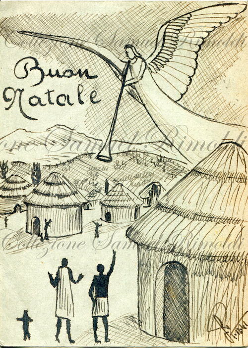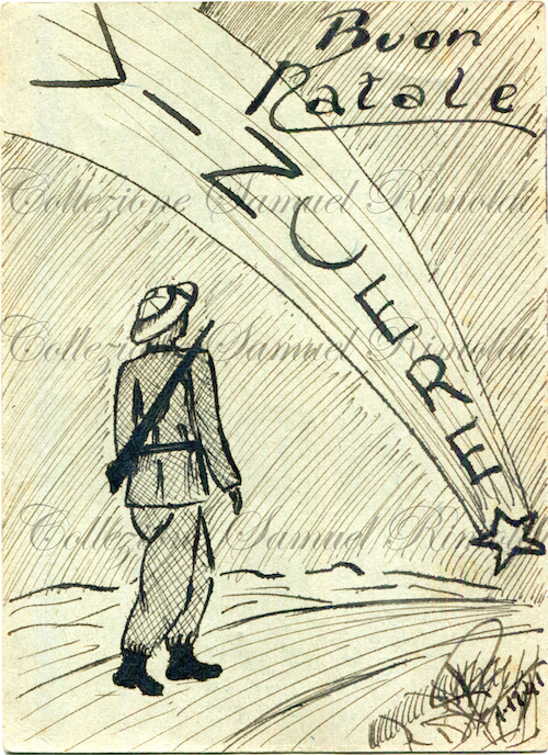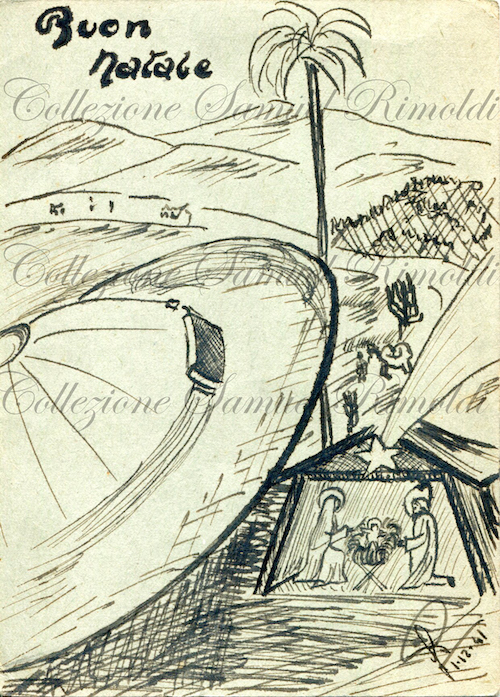 Tre cartoline inviate nel 1941 dallo stesso soldato, un aviere in servizio presso l'aeroporto n. 705 di Castel Benito in Libia. Nella prima un angelo suona il lieto annuncio sopra un villaggio africano, molto probabilmente del corno d'africa e non libico; nella seconda una stella cometa guida verso la vittoria un soldato italiano; nell'ultima un casco coloniale fa ombra alla capanna della natività.
