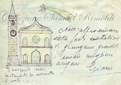 Il disegno quasi infantile apposto su questa cartolina riproduce una chiesa con una stella cometa e fa da cornice ad un messaggio d'auguri inviato alla famiglia da un fante del 265° Fanteria "Lecce" di stanza a Creta.