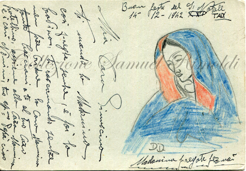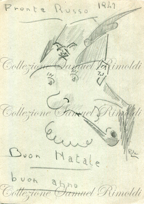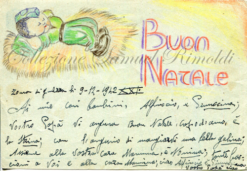 Due cartoline con disegni, uno a tema religioso e uno umoristico, ripresi da un carabiniere in servizio in Russia ed inviate ai suoi figli. La posta dal fronte russo, inoltrata per via ordinaria e non aerea, in media impiegava 15 giorni per giungere a destino quindi perchè un augurio natalizio possa raggiungere per tempo il destinatario, deve essere spedito nei primi giorni del mese.