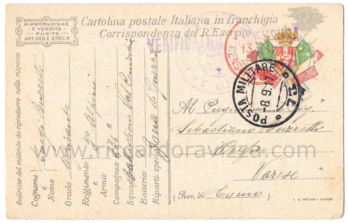 Omonimo ed amico del protagonista del libro Da Artigliere ad Ardito, in questa cartolina chiedeva informazioni riguardanti la salute del suo compaesano ardito.
