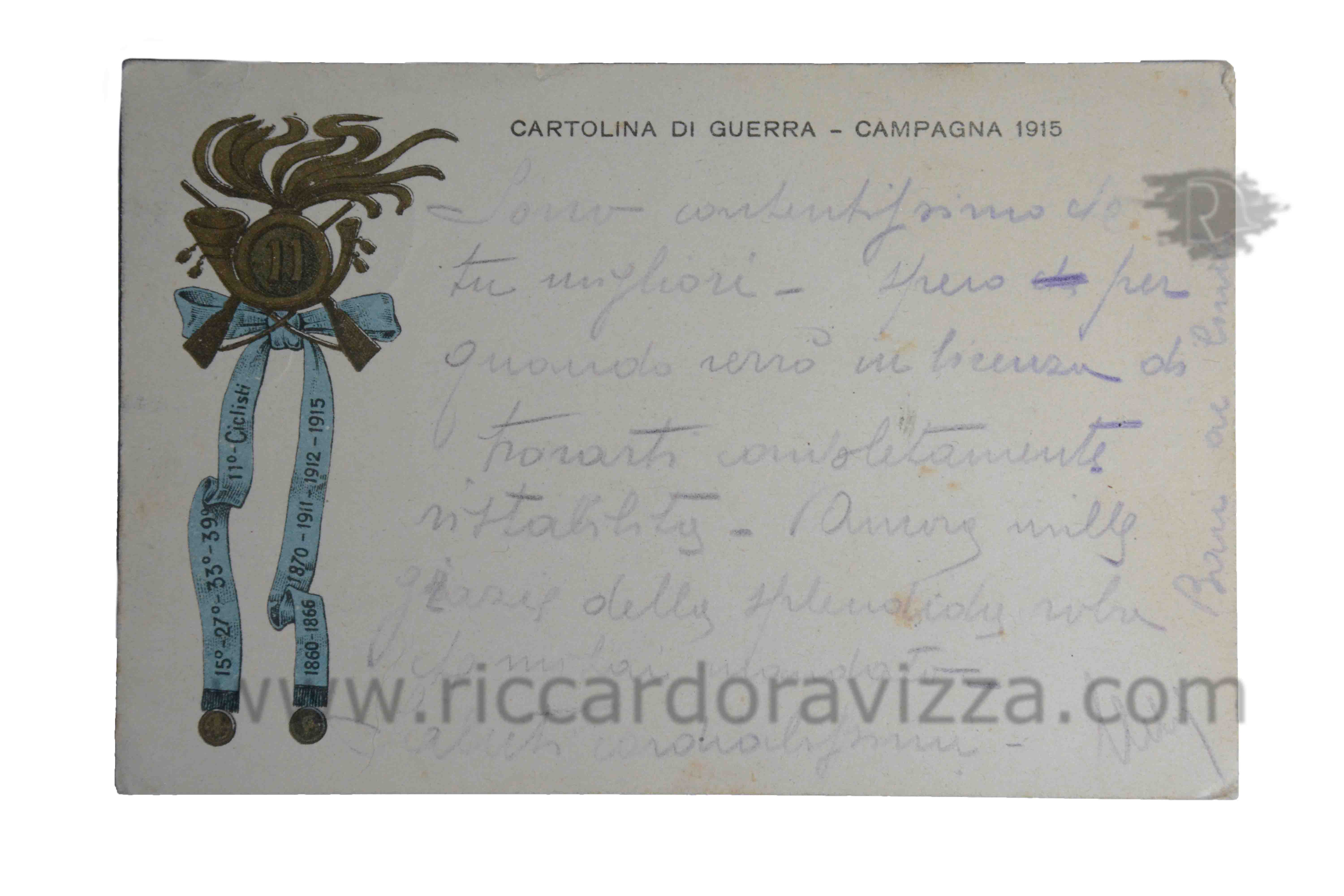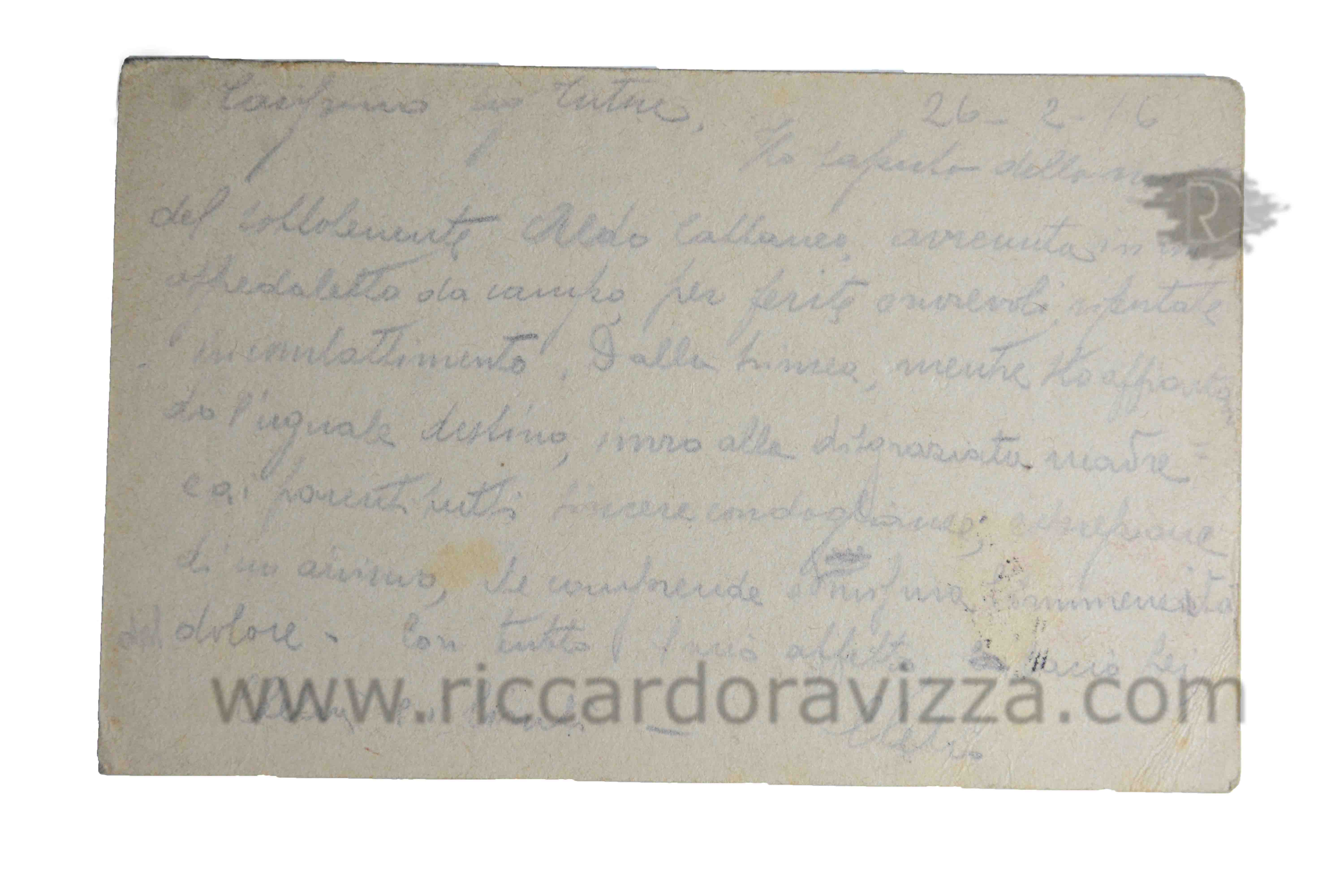 Dalla trincea, mentre sto affrontando l'uguale destino, invio alla disgraziata madre e i parenti tutti sincere condoglianze; espressione di un animo, che comprende e ....... l'immensità del dolore.