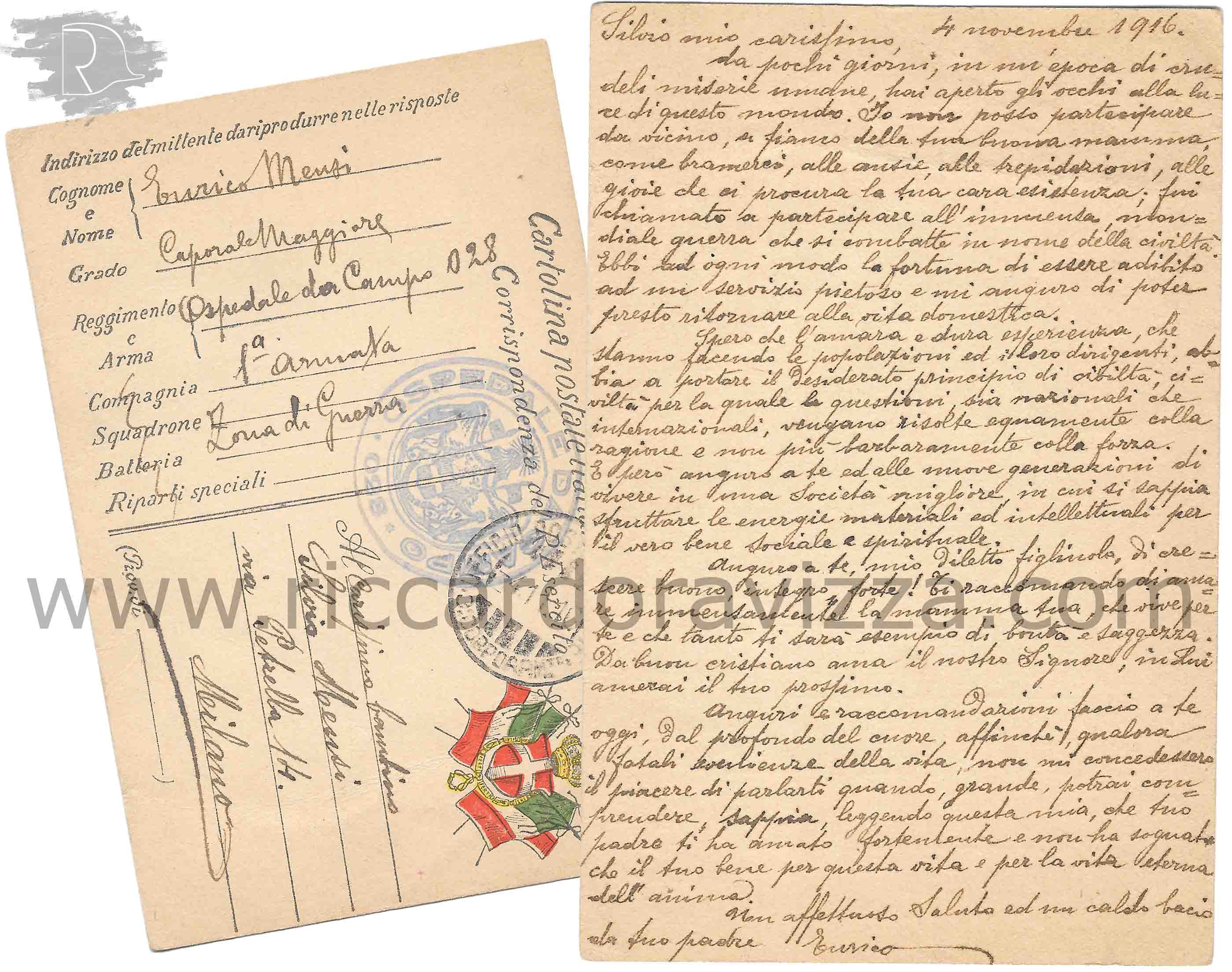 Io non posso partecipare da vicino, a fianco della tua buona mamma come bramerei, alle ansie, alle trepidazioni, alle gioie che ci procura la tua cara esistenza; fui chiamato a partecipare all'immensa mondiale guerra che si combatte in nome della civiltà.