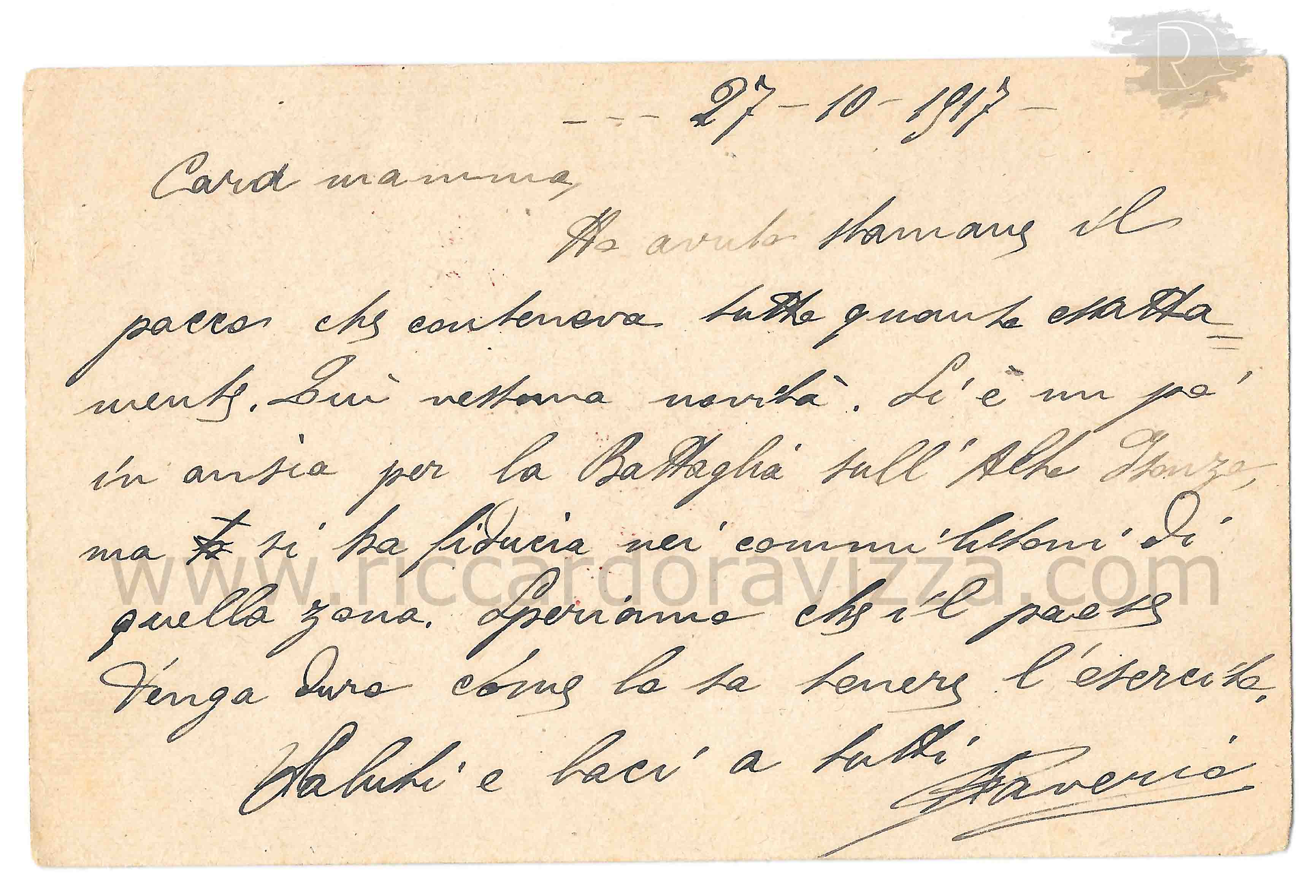 Si è un po' in ansia per la Battaglia sull'Alto Isonzo, ma si ha fiducia nei commilitoni di quella zona. Speriamo che il paese tenga duro come lo sa tenere l'esercito.