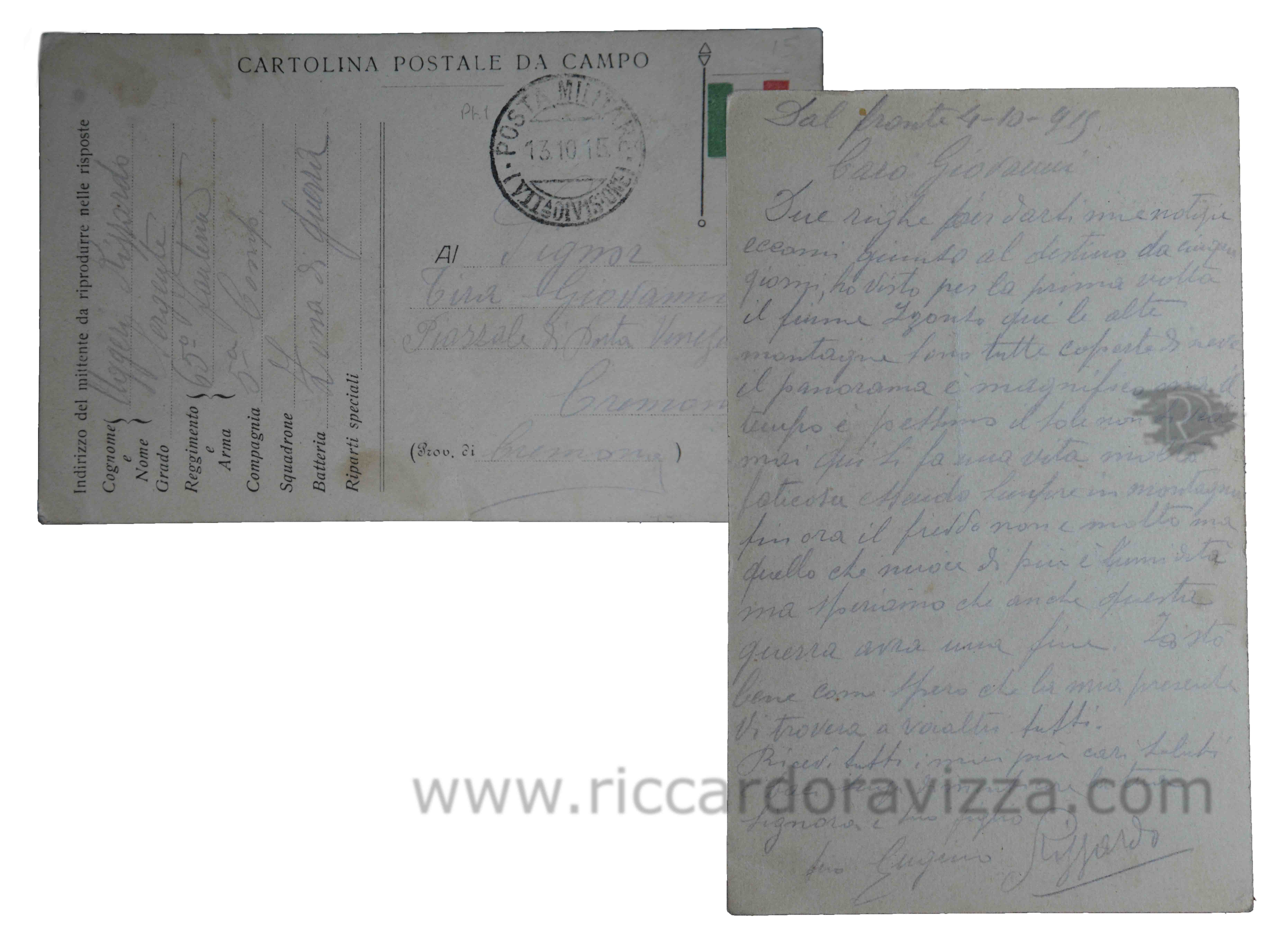 due righe per darti mie notizie eccomi giunto al destino da cinque giorni, ho visto per la prima volta il fiume Isonzo. Qui le alte montagne sono tutte coperte di neve il panorama è magnifico ma il tempo è pessimo il sole non si vede mai qui si fa una vita molto faticosa essendo sempre in montagna fin ora il freddo non è molto ma quello che nuoce di più è l'umidità ma speriamo che anche questa guerra avrà una fine.