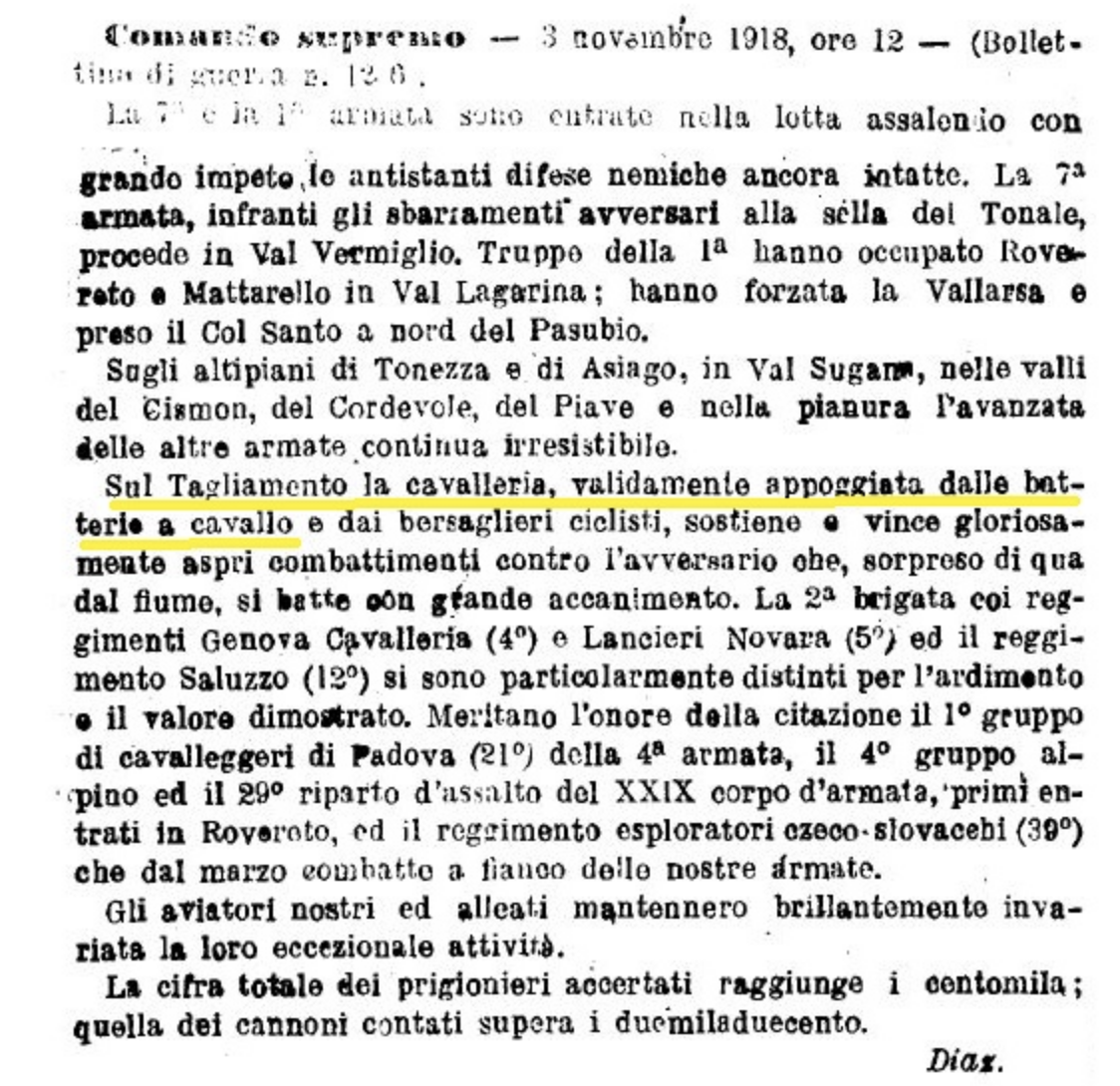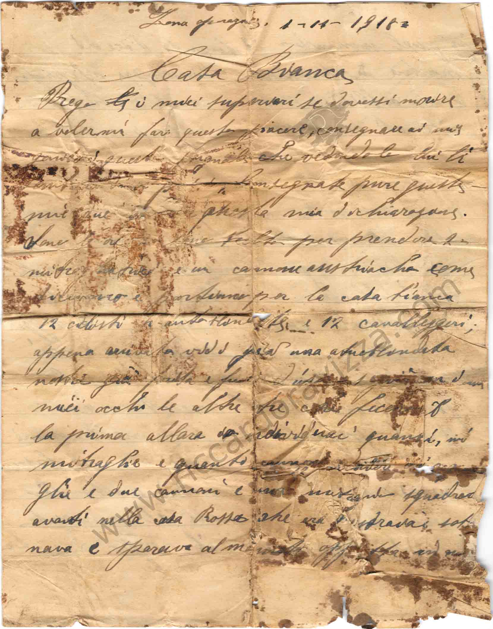 Prego i miei superiori se dovessi morire a volermi fare questo piacere, consegnate ai miei genitori questo pugnale, che vedendolo lui li……., consegnate pure queste mie due righe e questa mia dichiarazione. Sono le ore 4 e sono stato scelto per prendere 2 mitragliatrici e un cannone Austriache come dichiarato e partimmo per la casa bianca 12 ciclisti 4 autoblindati e 12 cavalleggeri; appena arrivati vidi già una autoblindata nostra già ferma e fuori d’uso. Seguo con i miei occhi le altre tre che facend….. la prima allora ne individuai quanti…… mitraglie e quanti cannoni …….glie e due cannoni e una mitragliatrice …….. avanti nella casa rossa che era di ……nava e sparava al m….. app….. in quel momento il tenente dice di montare in bicicletta e di avanzare nel prato, io non obbedì e presi 6 cavalli che sono rientrati senza uomo e restai per qualche minuto ad osservare i miei compagni che giunti a 300 metri dalla casa rossa….. una tremeda scarica di mitraglia aiutate dalle altre 7 schierate lungo la siepe della casa bianca, in quel momento esce un tenente dall’autoblinda che tutto ferito si trascina nel piccolo canale d’acqua che costeggia la strada, e io che sono ancora coi cavalli in mano vedo un tedesco che si avvicina e con questo pugnale che tiene nelle mani (capii) che intenzioni aveva, lasciai (deduco i cavalli) e mi lanciai contro lui…… il pugnale al momento…… forse dando il colpo a nostro tenente e avuto in possesso il pugnale che colpito diverse volte finchè cadde a terra, animai il tenente che nel frattempo non sapeva come ringraziarmi lo adagiai alla ruota e un pensiero mi venne a me, presi la mia bicicletta e via al comando del reggimento a riferire ciò che io di mio genio sapevo, mi recai dal mio colonnello e non volle nemmeno sentirmi forse perché mi aveva visto molto bianco e mi recai dal Signor Generale Guicciardi comandante la 3° divisione di cavalleria e raccontai quasi senza fiato che c’è il nemico con 8 mitraglie e due cannoni, mi diede dalla sua borraccia un bicchiere d’acqua e me ne andai, ritornato al mio squadrone nessuno mi chiese nulla e mi sdraia sotto una siepe con la mia bicicletta in mezzo alle gambe e mi addormentai. Mi sono svegliato verso le 20 e non vidi nessuno, e quasi avevo paura che l’ordine fatto da me non andasse bene, e non sapevo come fare, decisi di aver agito da buon soldato e da vero Italiano, andai in cerca del reggimento che ho trovato indietro circa 6 chilometri e non dissi niente a nessuno di quello che ho scritto qui.