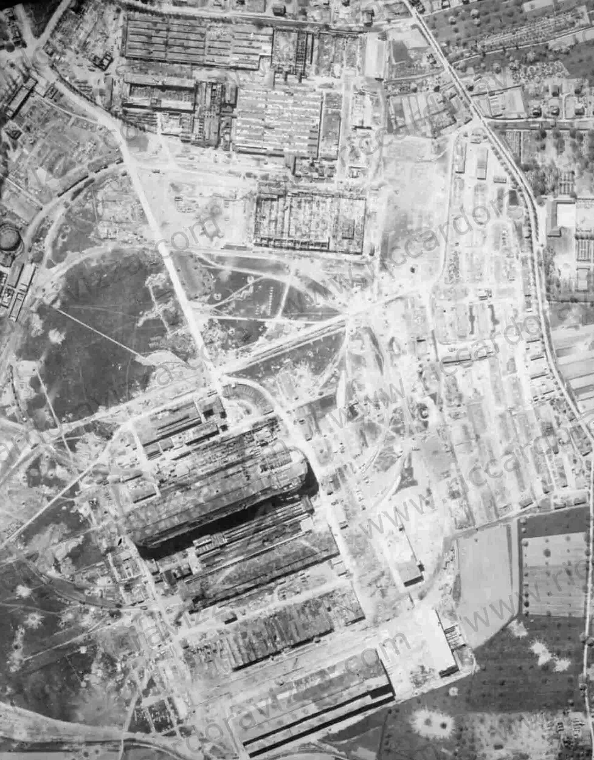 Friedrichshafen, aprile 1944. La fabbrica di motori Maybach, l'hangar Luftschiffbau Zeppelin e 60 capanne mostrano gravi danni dovuti al bombardamento.
